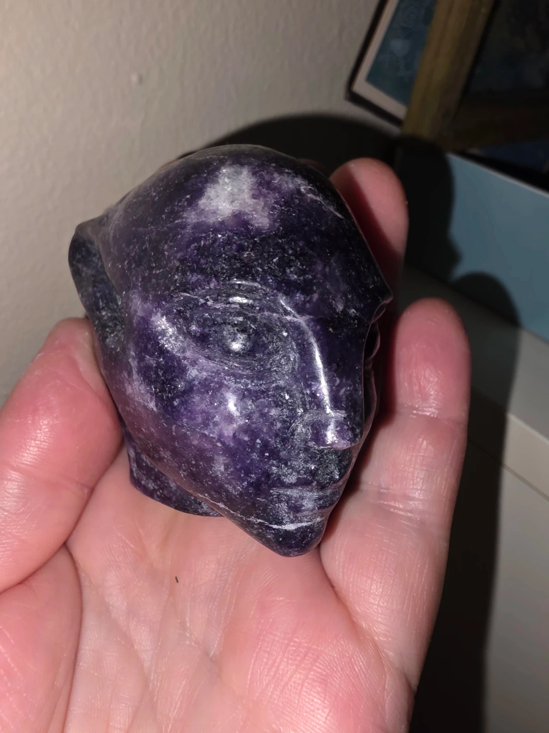 This is a unique carving of avatar made from lepidolite. It's a lovely decorative piece for any space.