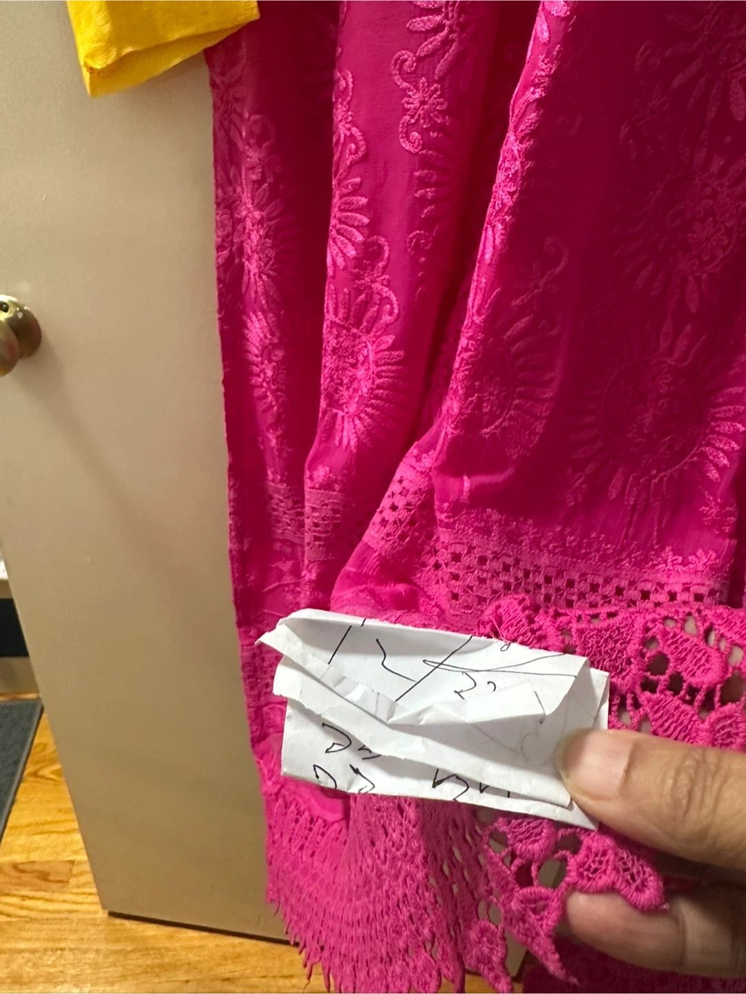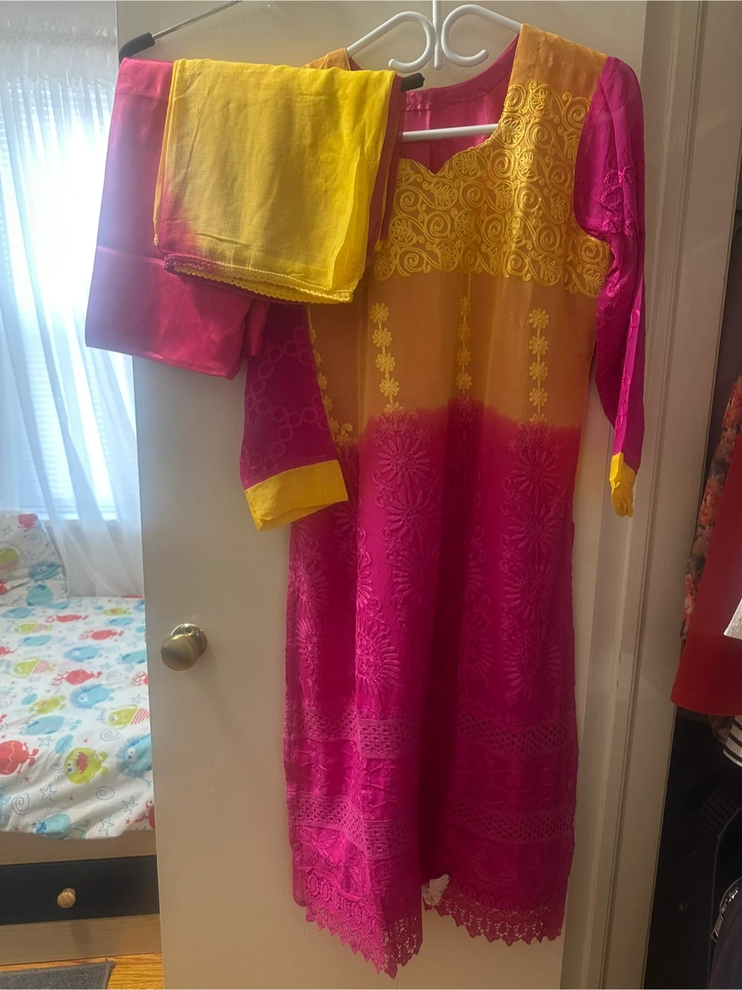 Beautiful salwar kameez in pink and yellow with all over intricate embroidery. Perfect for a special occasion or everyday wear. The set includes the kameez (tunic), salwar (pants), and dupatta (scarf).