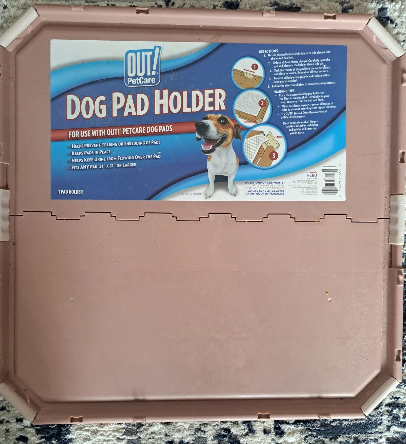 OUT! PetCare Dog Pad Holder keeps pads in place and prevents tearing. It helps keep urine from flowing over the pad and fits any 21" x 21" or larger pad. This holder is useful for house-training puppies.