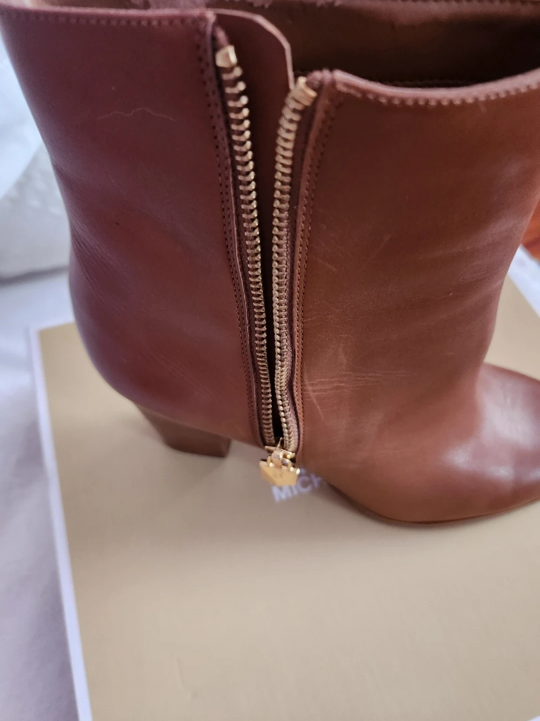 Stylish brown leather ankle boots from Michael Kors. They feature a side zipper with a gold-tone charm detail and a block heel. Genuine leather construction.