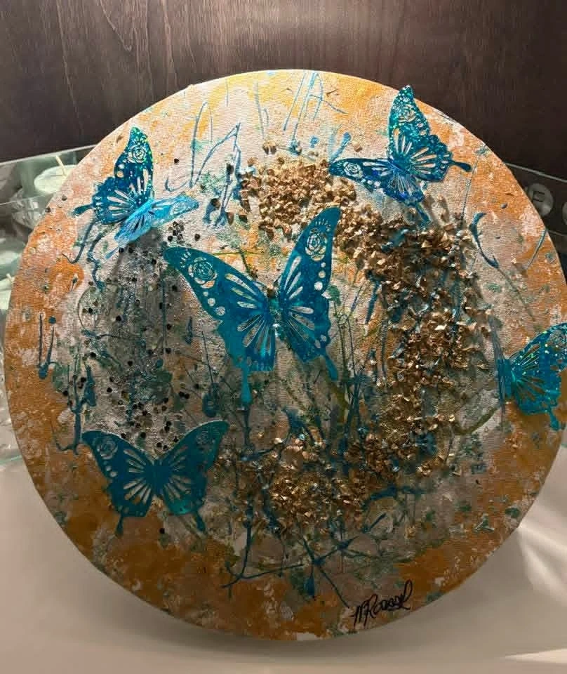 Textured circular art piece with raised metallic gold accents and blue butterfly embellishments. It features a mix of paint, glitter, and textured elements on a round canvas.