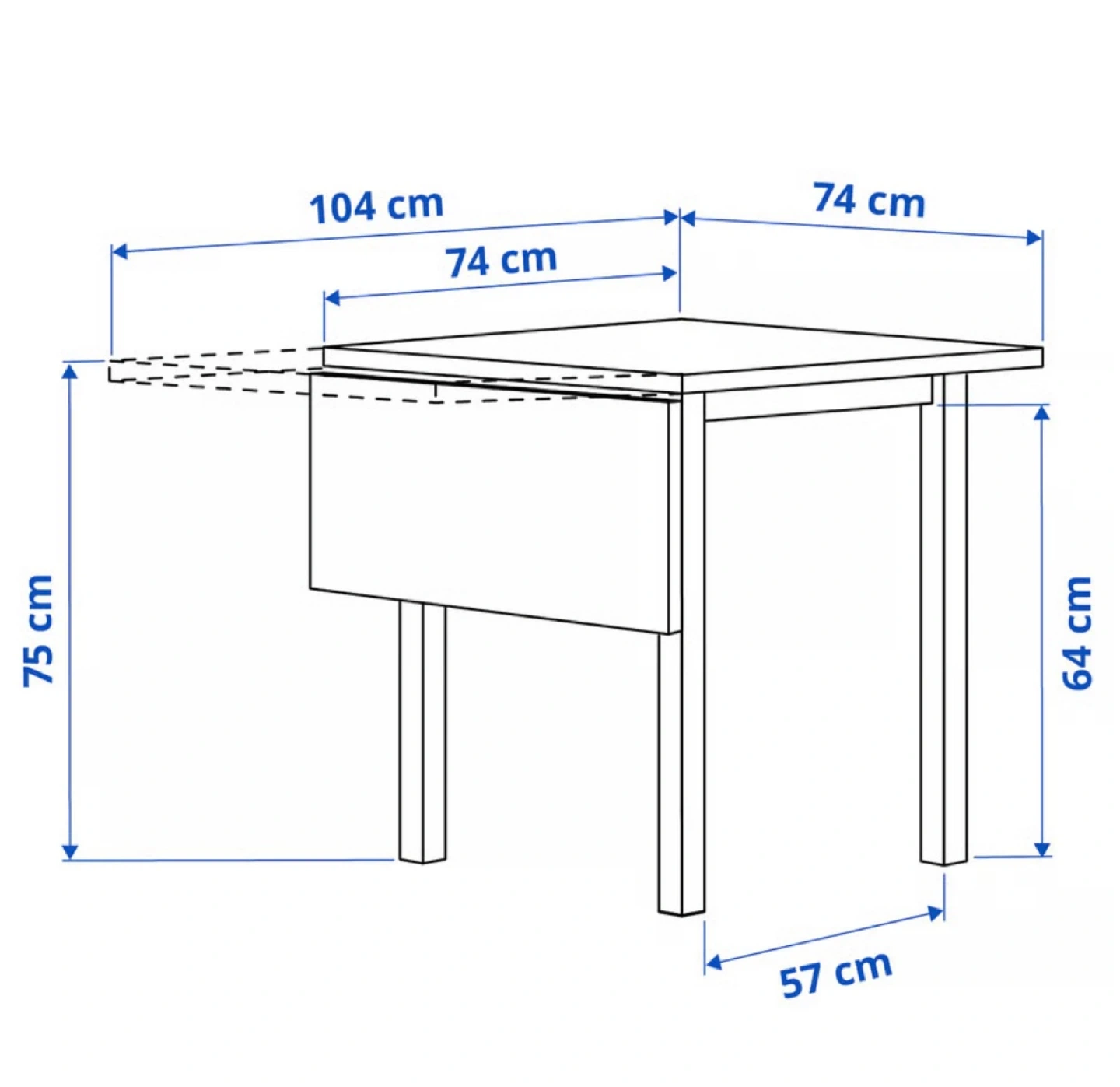This is the IKEA NORVIKEN drop-leaf table in black. It's 74cm wide when both leaves are down, extending to 104cm when one leaf is up. The table's height is 75cm. This table's compact size and extendable leaves make it handy for smaller spaces or for when you need a bit more surface area!