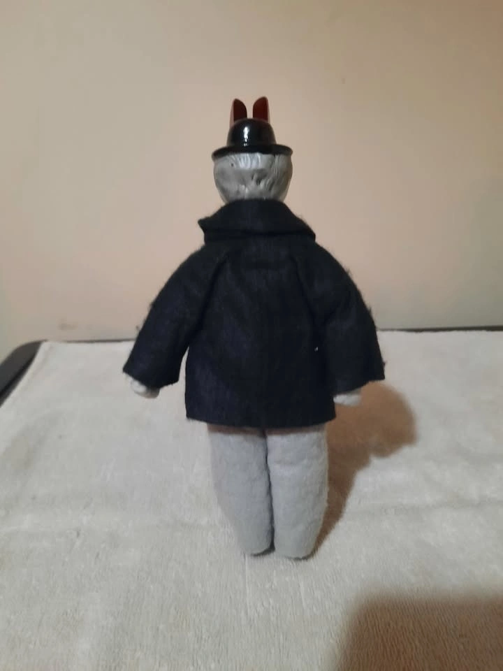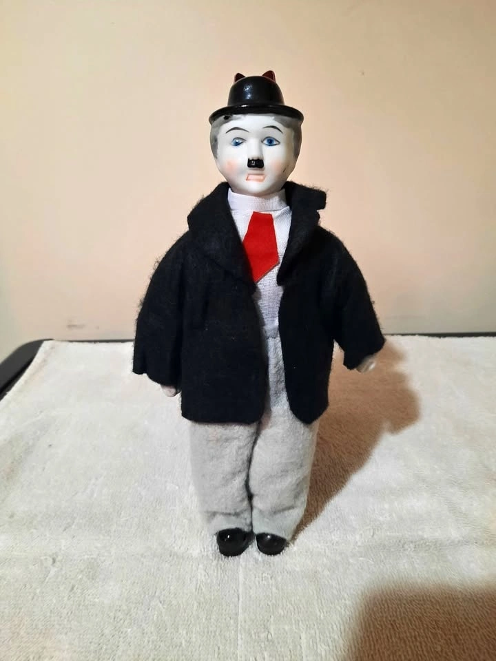 Hardy from Laurel and Hardy 9" doll. Porcelain head, feet, and hands. Felt clothing. Overall item is in good condition with minor scuffs.