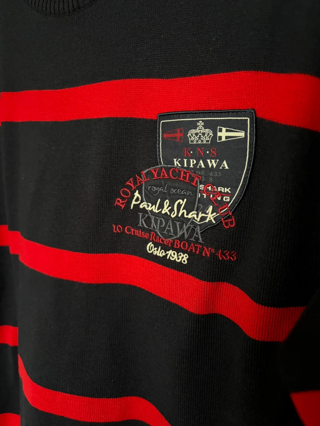 Selling a Paul & Shark sweater with red stripes on a black background. It's in great condition and ready for a new owner!