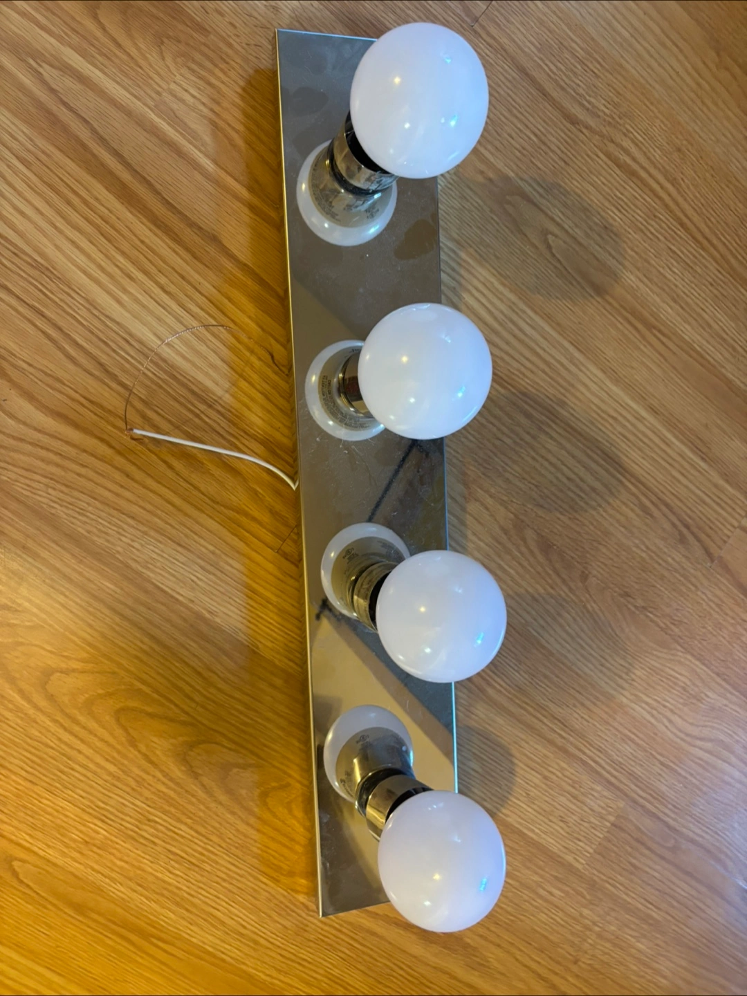 Chrome finish. Four bulbs included. Ready to install. Minimalist design. Perfect for bathroom or hallway.