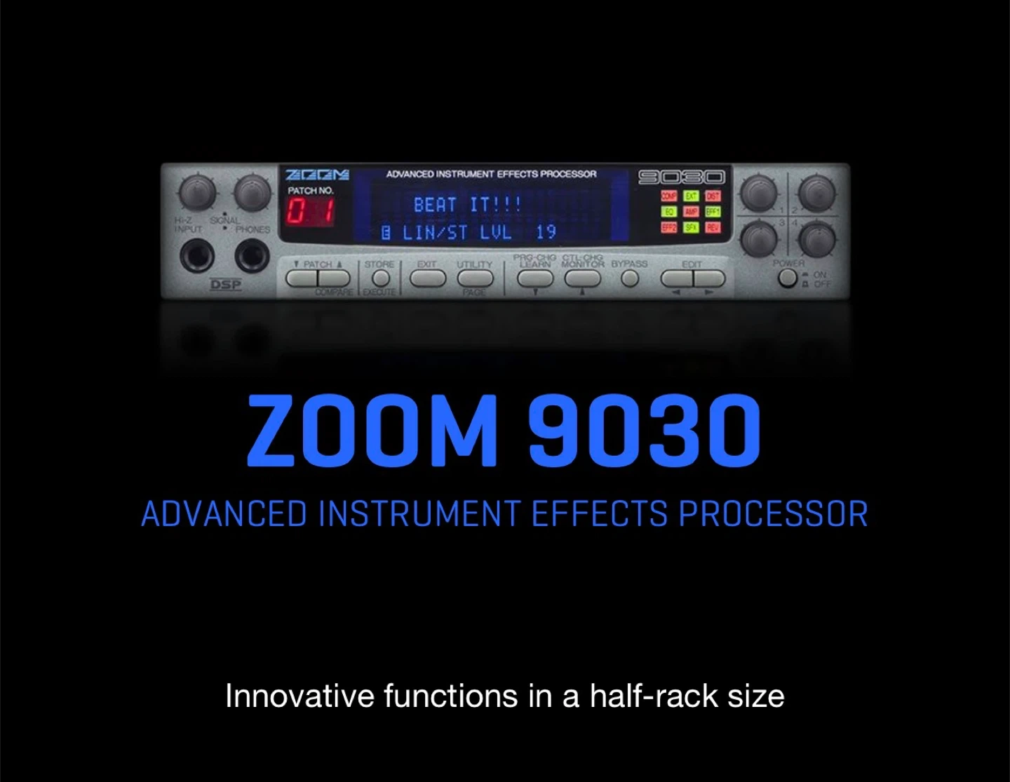 The Zoom 9030 is a classic, half-rackmount digital multi-effects processor from the early 90s, known for its high-quality sounds, MIDI control.