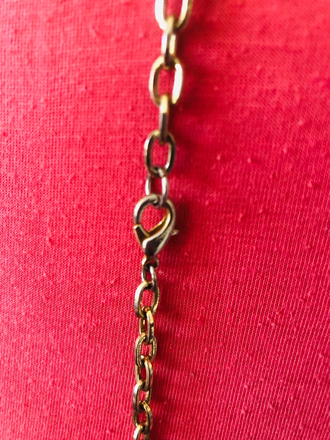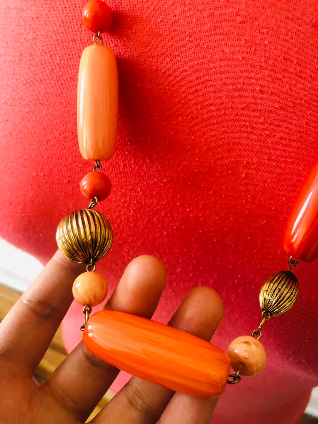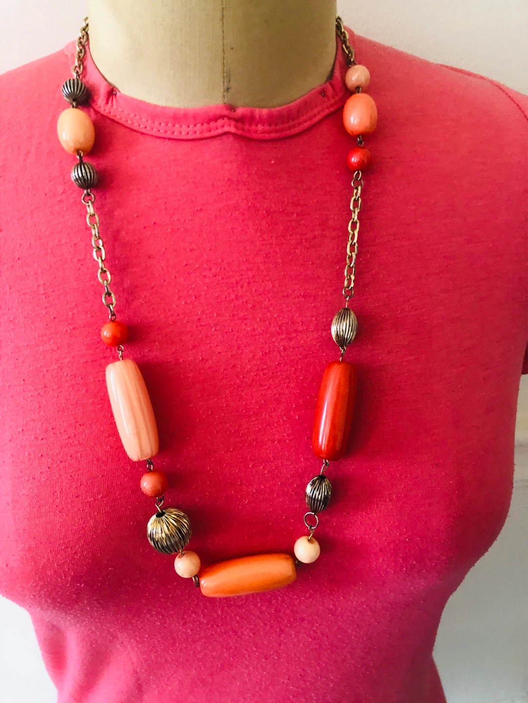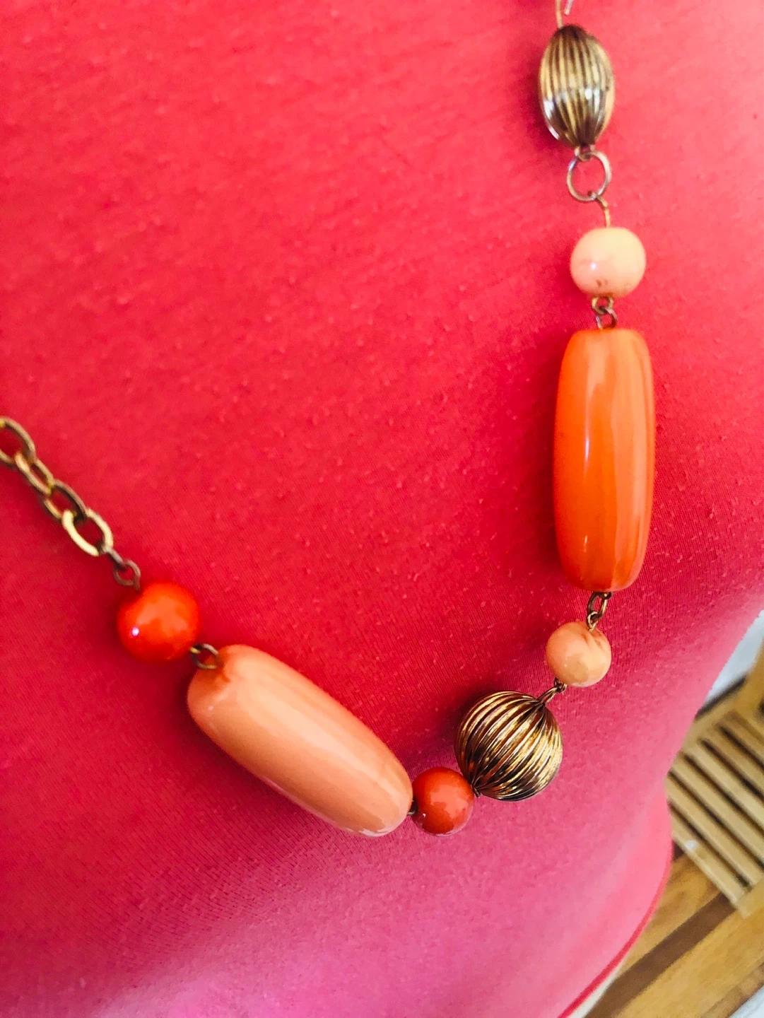 Chunky beaded necklace with orange, peach, and gold-tone accents. Features a lobster claw clasp. Great for adding a pop of color to any outfit!