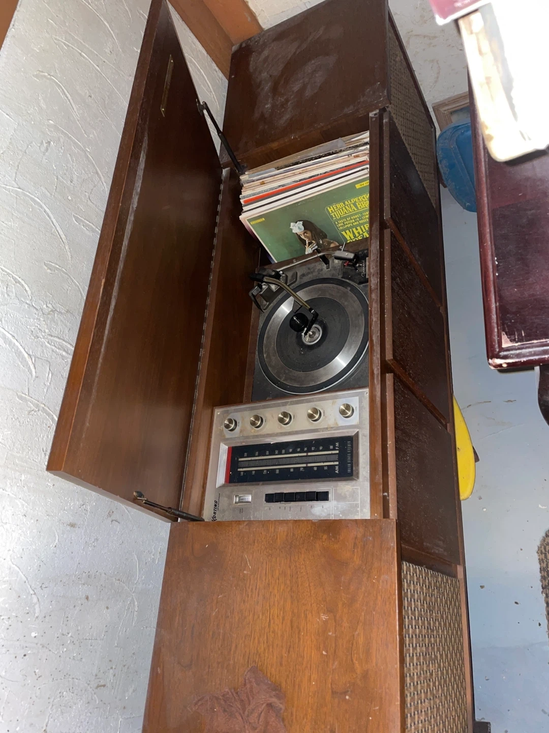 Vintage Korting console record player. It's a complete unit with a turntable and radio. Made of wood with a classic design. has not been used in a couple years.