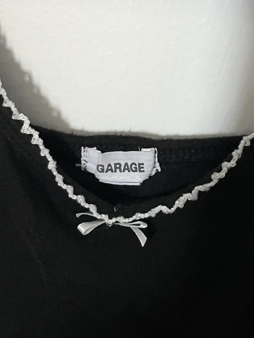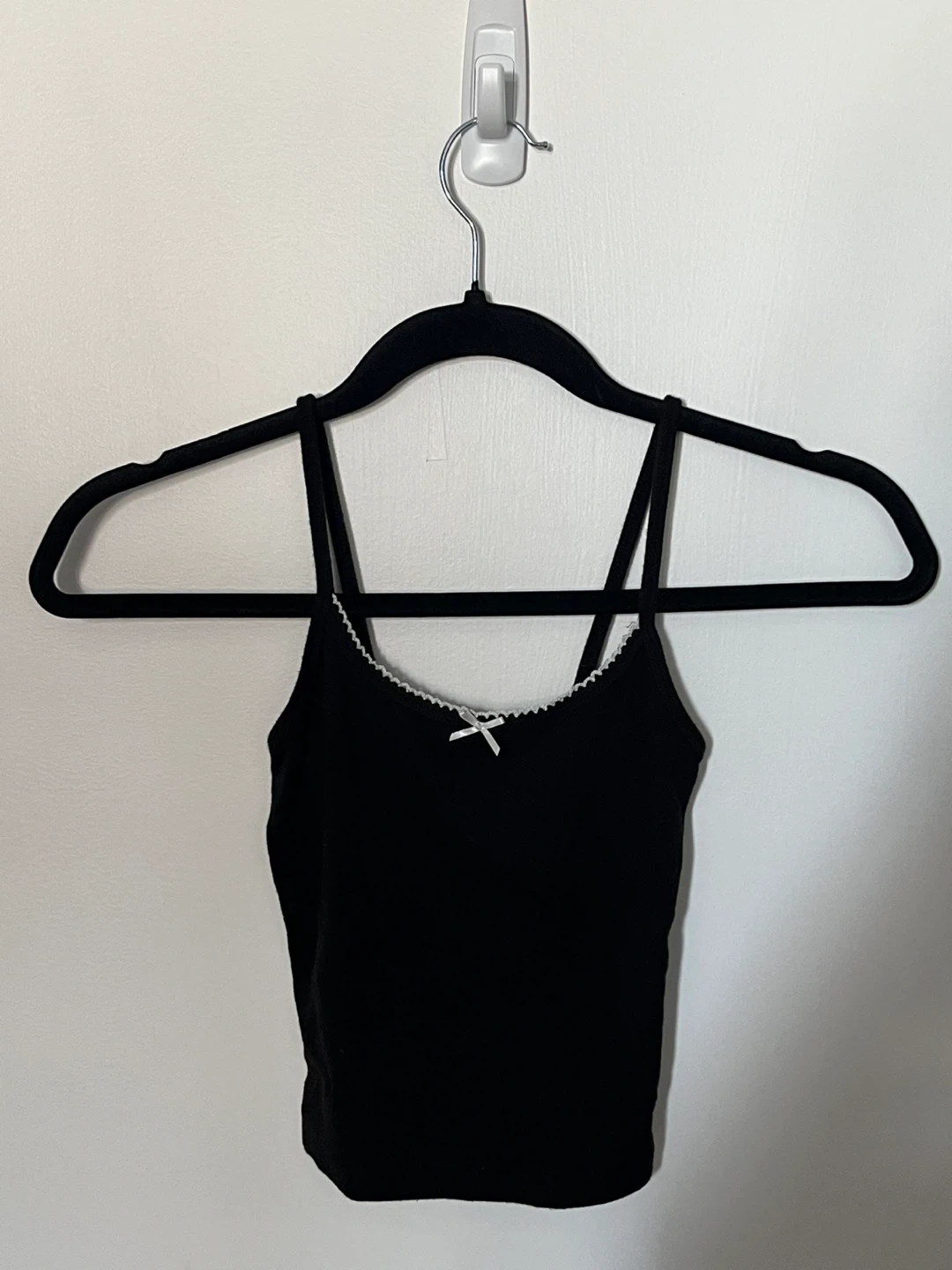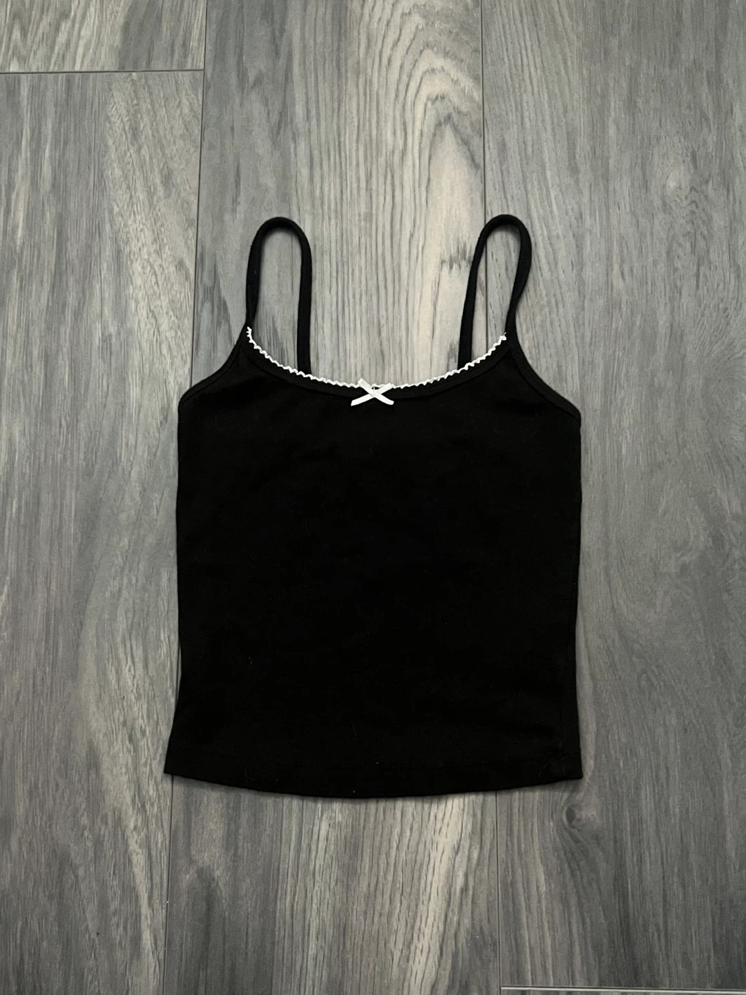 Black tank top featuring white trim and small bow. Soft and comfortable material.