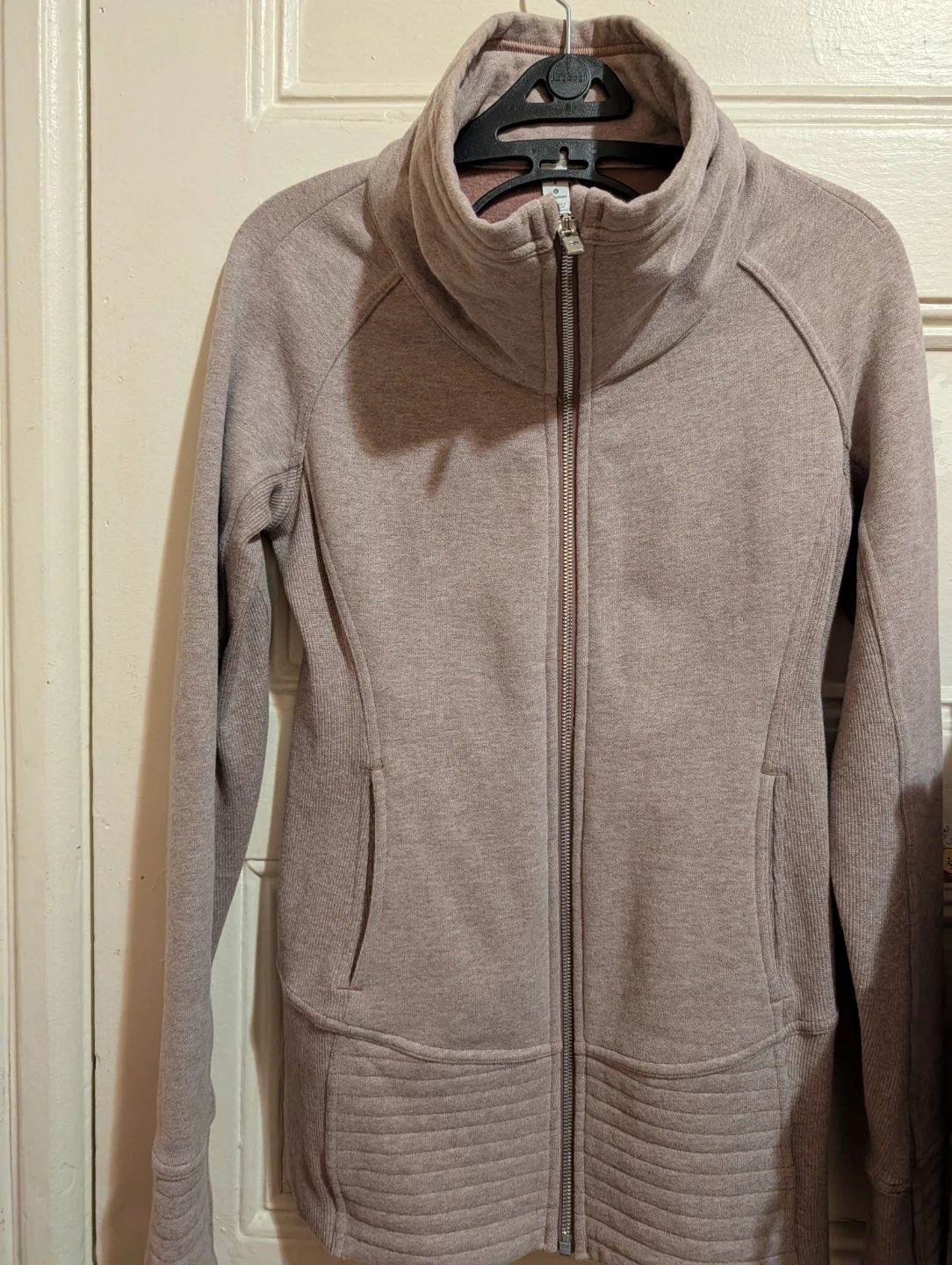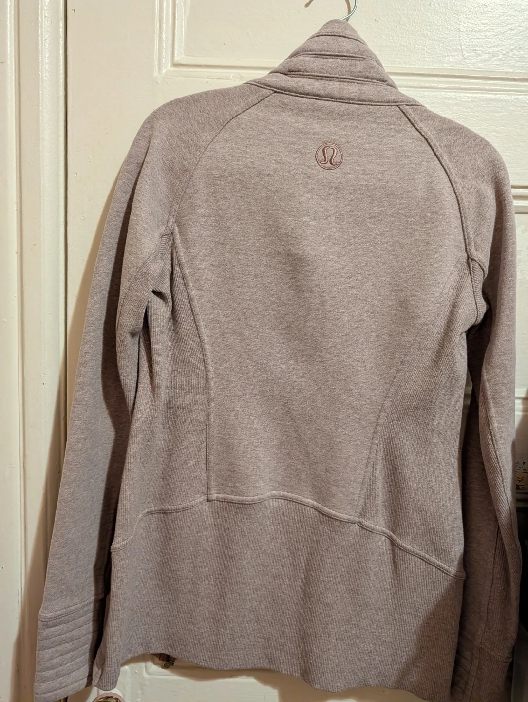 This Lululemon jacket is made from a cotton blend. It features a full zip closure and two front pockets. The ribbed detailing at the hem adds a stylish touch. It's great for workouts or casual wear!