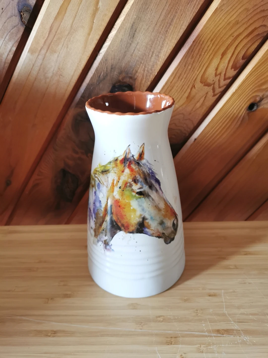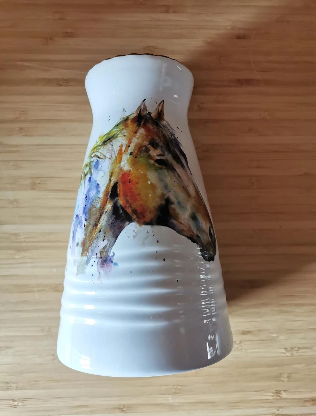 Beautiful stoneware vase featuring a vibrant watercolor-style horse design by artist Dean Crouser. Dean Crouser is known for vibrant, loose watercolor-style wildlife art inspired by nature, fishing, and the outdoors. His designs are widely licensed onto home decor like mugs, vases, and wall art.