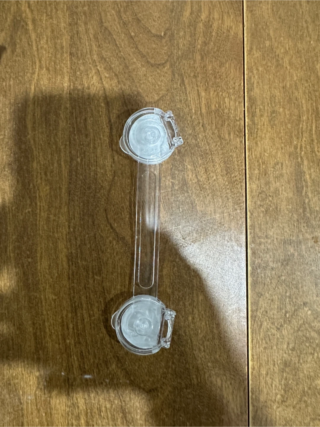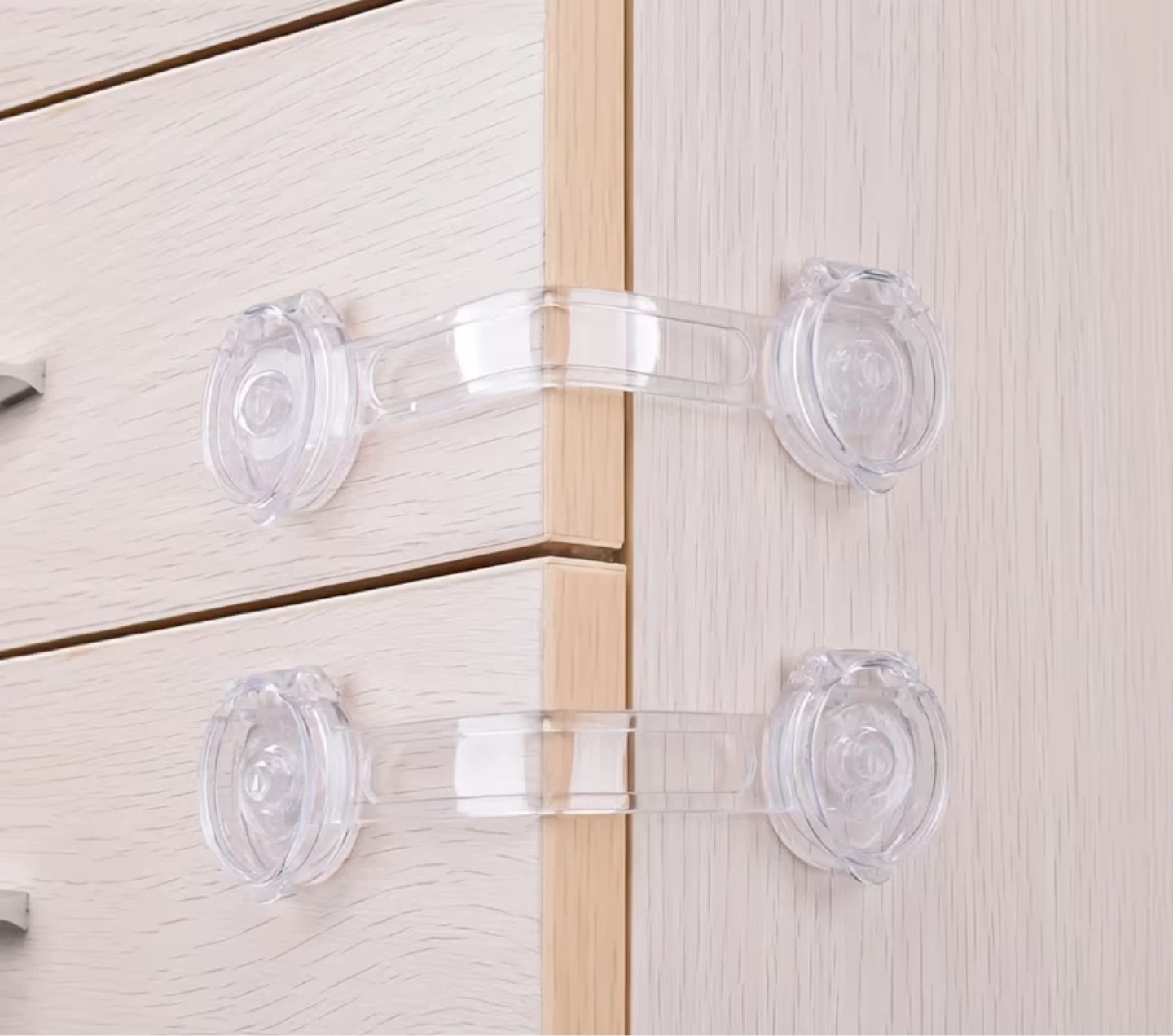 Bag of 20 pack clear plastic child safety locks for cabinets, drawers, and refrigerators. These locks feature an adhesive backing for easy installation and removal. They're designed to help keep little ones safe around the house. Easy to use for adults!