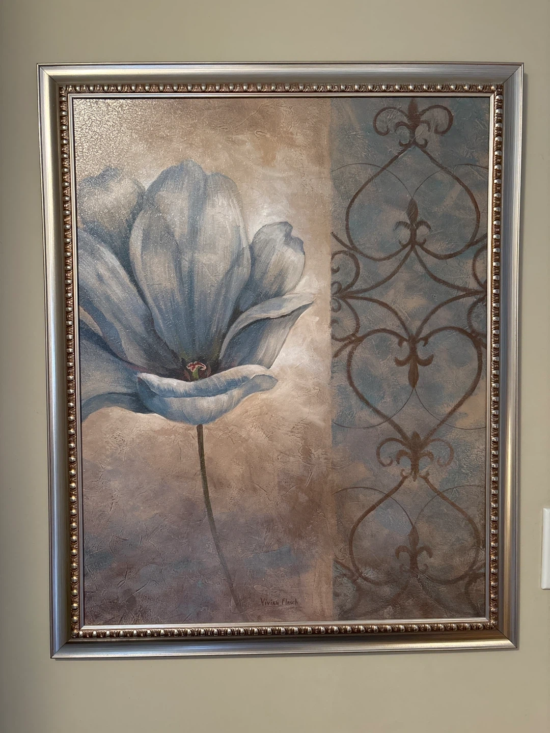 This framed wall art features a large blue floral design with decorative background elements. It's signed by the artist, Vivian Flasch. Comes in a silver-toned frame. 25.5” W X 31” H