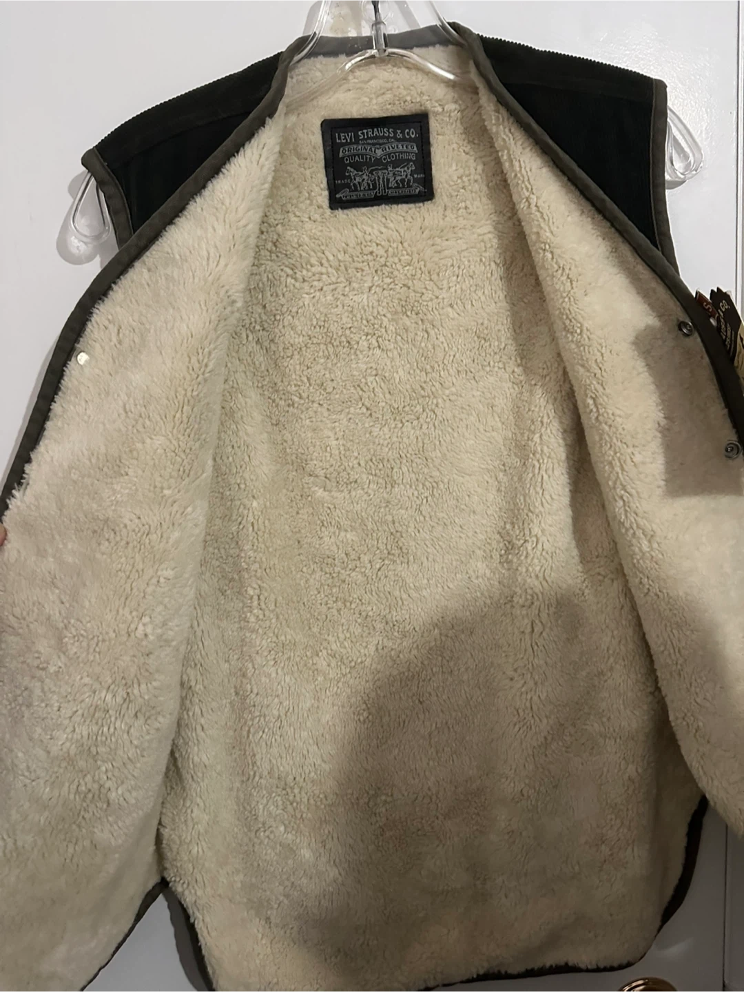 This is a Levi's sherpa lined corduroy vest. It's dark green with a full button-up front. Size is small. This vest is great for layering on cooler days! Brand new with tags, never worn, all buttons are functional and secure.