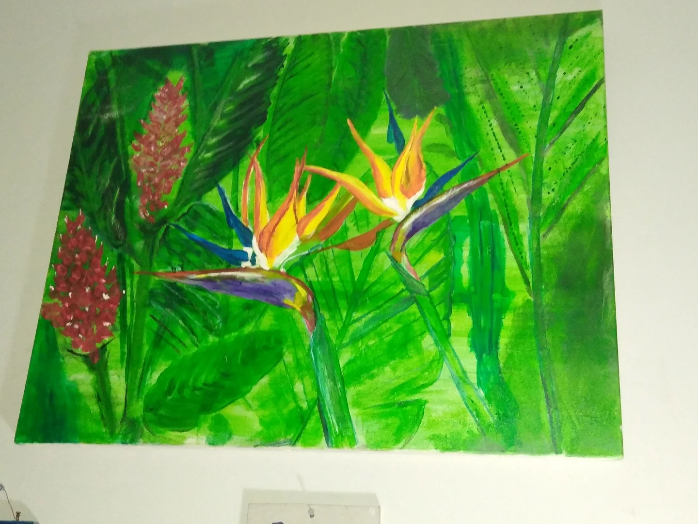 This is a one-of-a-kind painted by the artist just from my house and it is of Red Ginger Hawaiian flower and also bird of paradise Hawaiian flower it's very very exquisite and very well done. A real statement piece