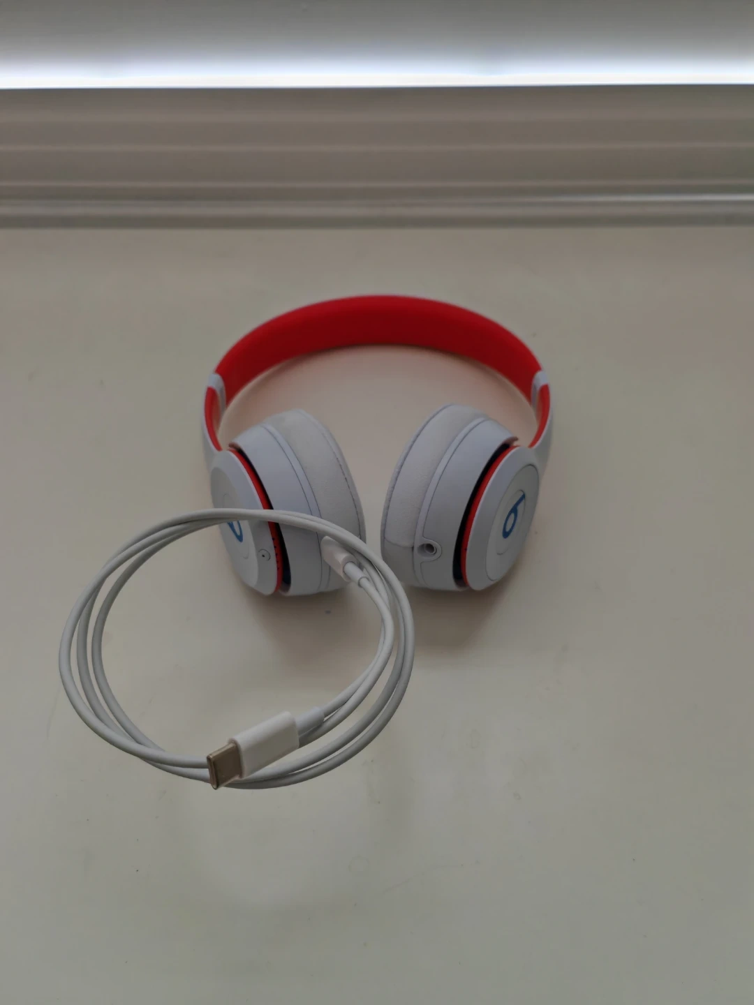 These are Beats Solo3 wireless on-ear headphones in white with red accents. They connect wirelessly and come with a charging cable. Rarely used, in very good condition.