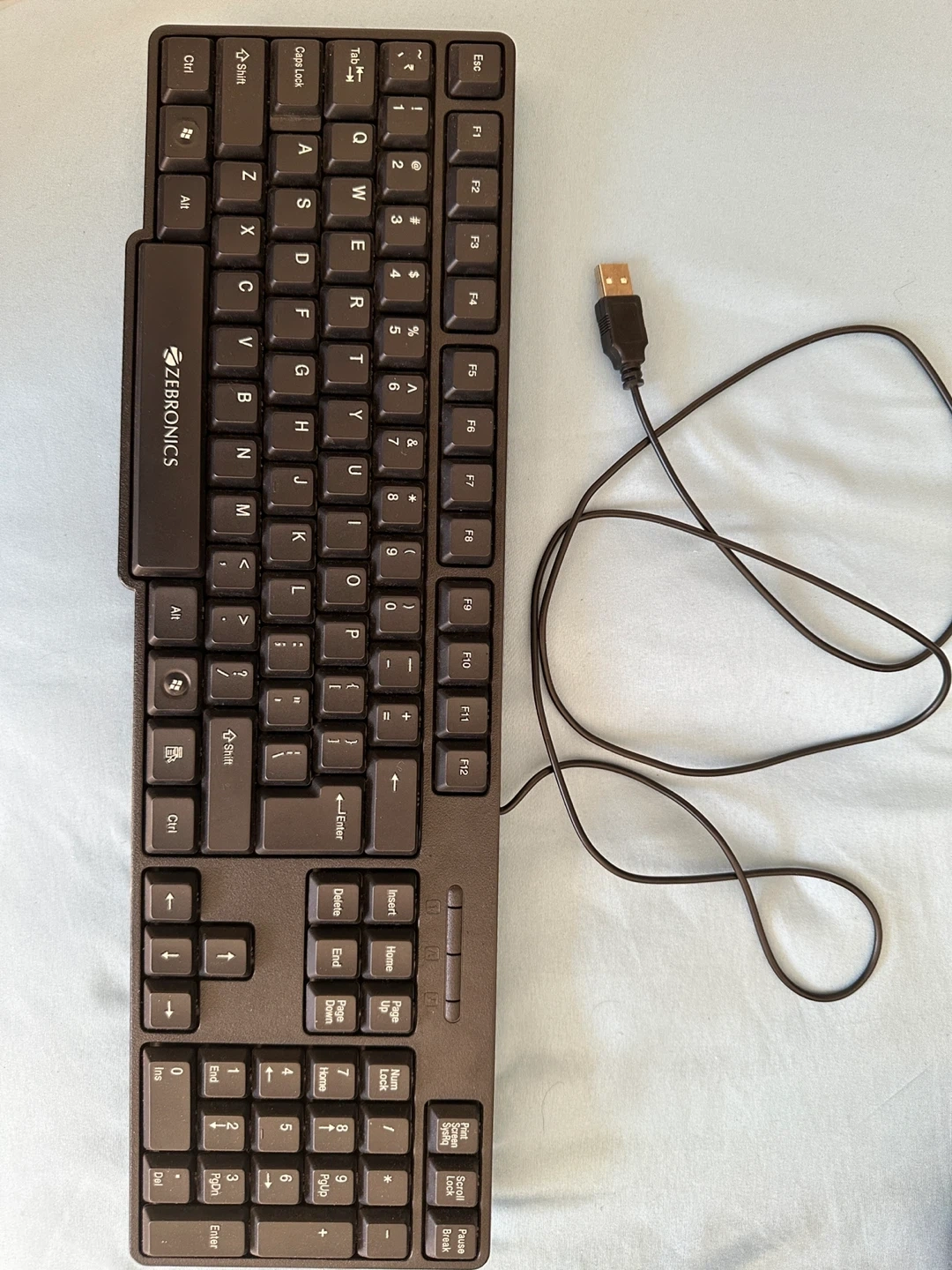 This is a Zebronics wired keyboard. It connects via USB. Features a standard QWERTY layout with a numeric keypad.