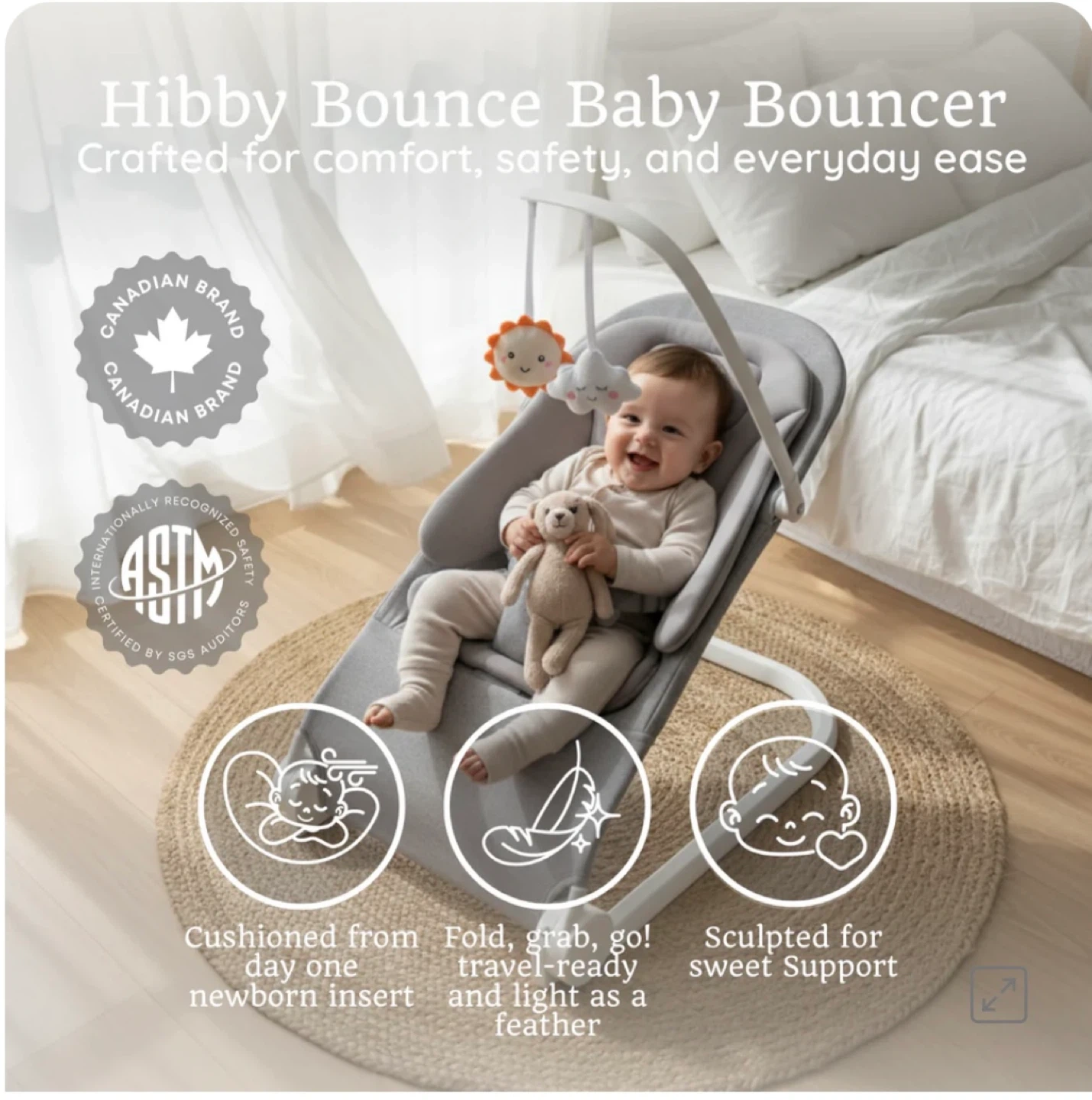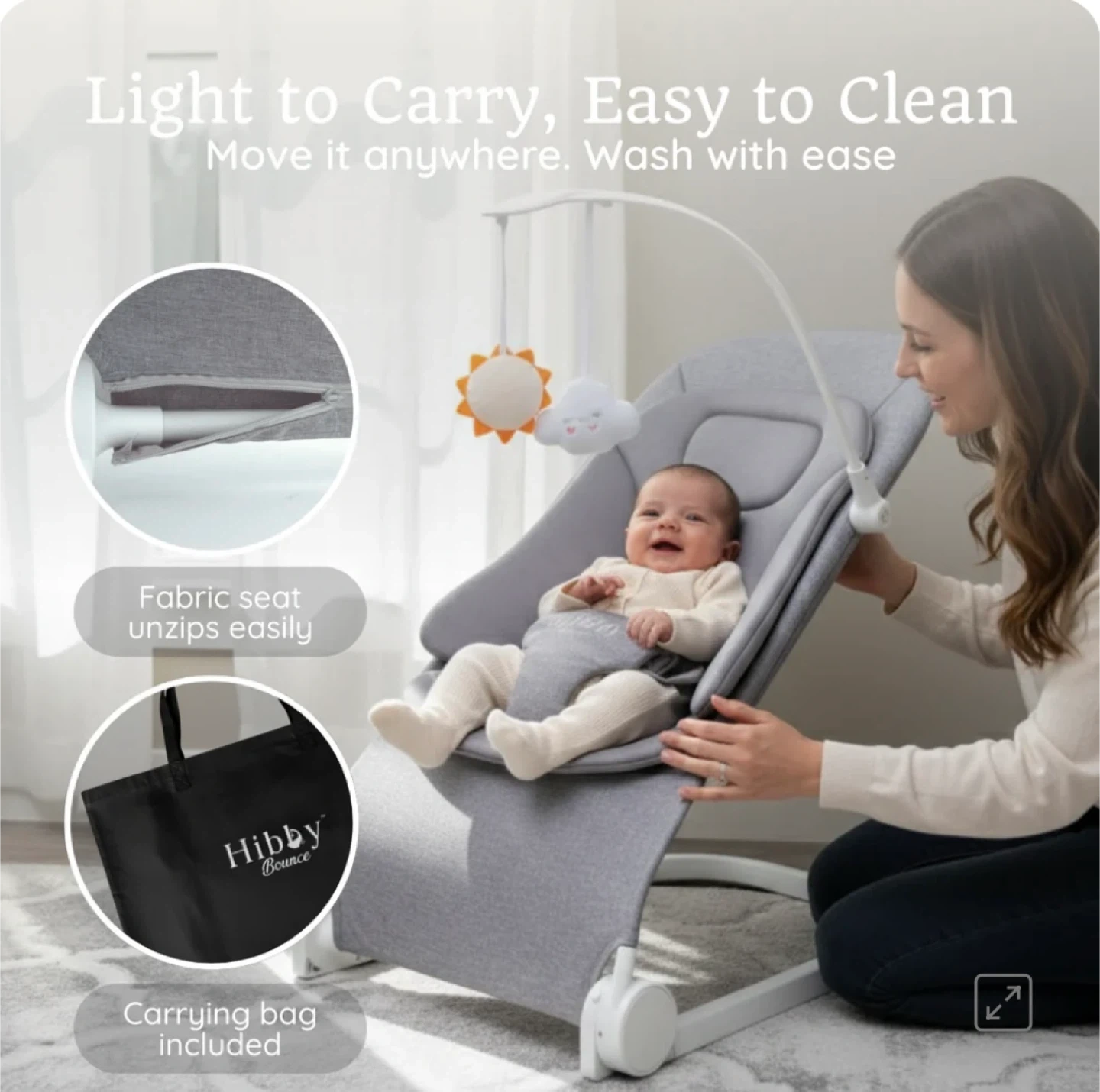 This Hibby Bounce baby bouncer is designed for everyday life. It's lightweight, foldable, and comes with a removable toy bar. The fabric seat unzips easily for cleaning and a carrying bag is included. New, in the box. Pink. Cash only, no e-transfers. Pick up only
