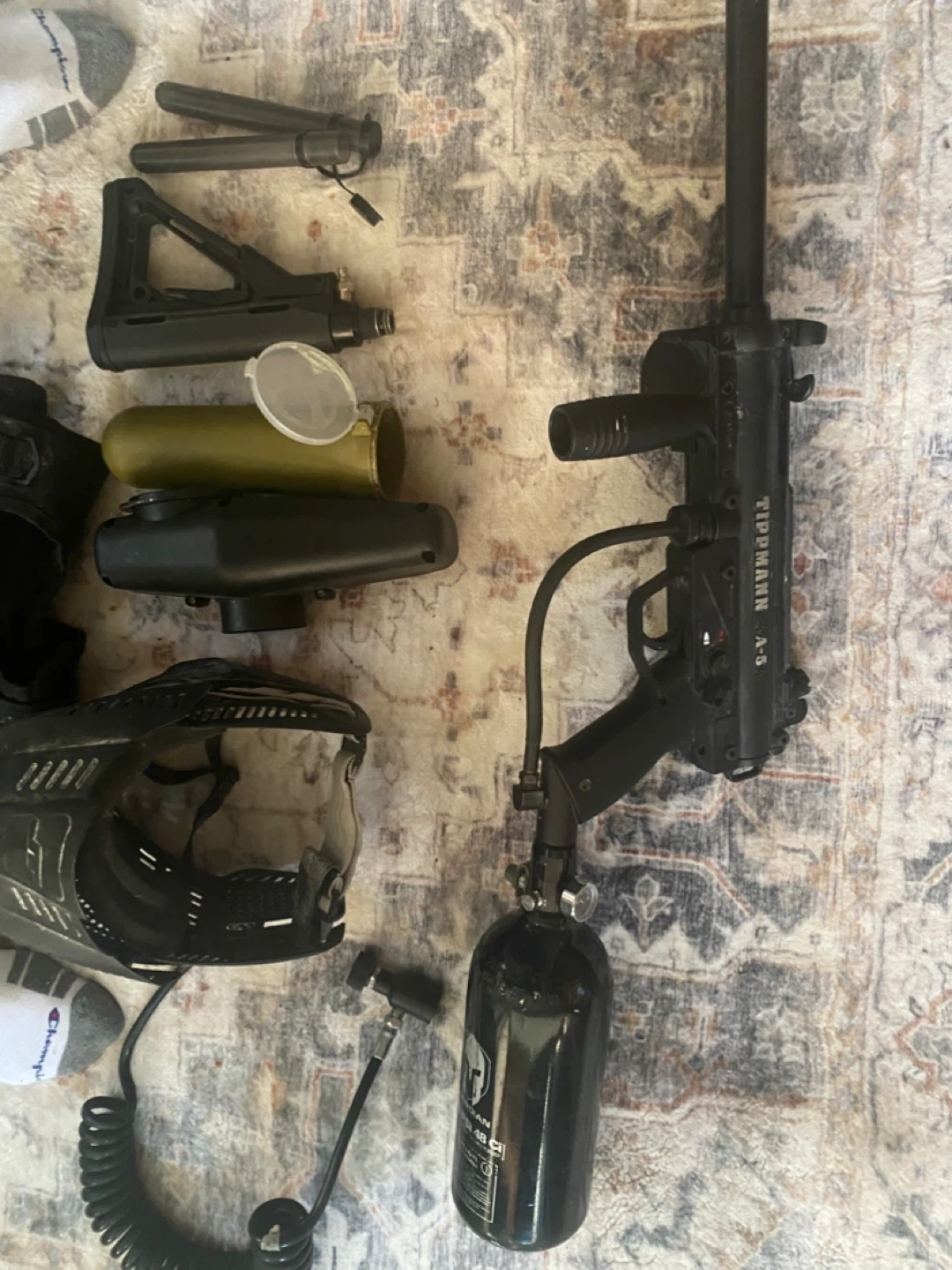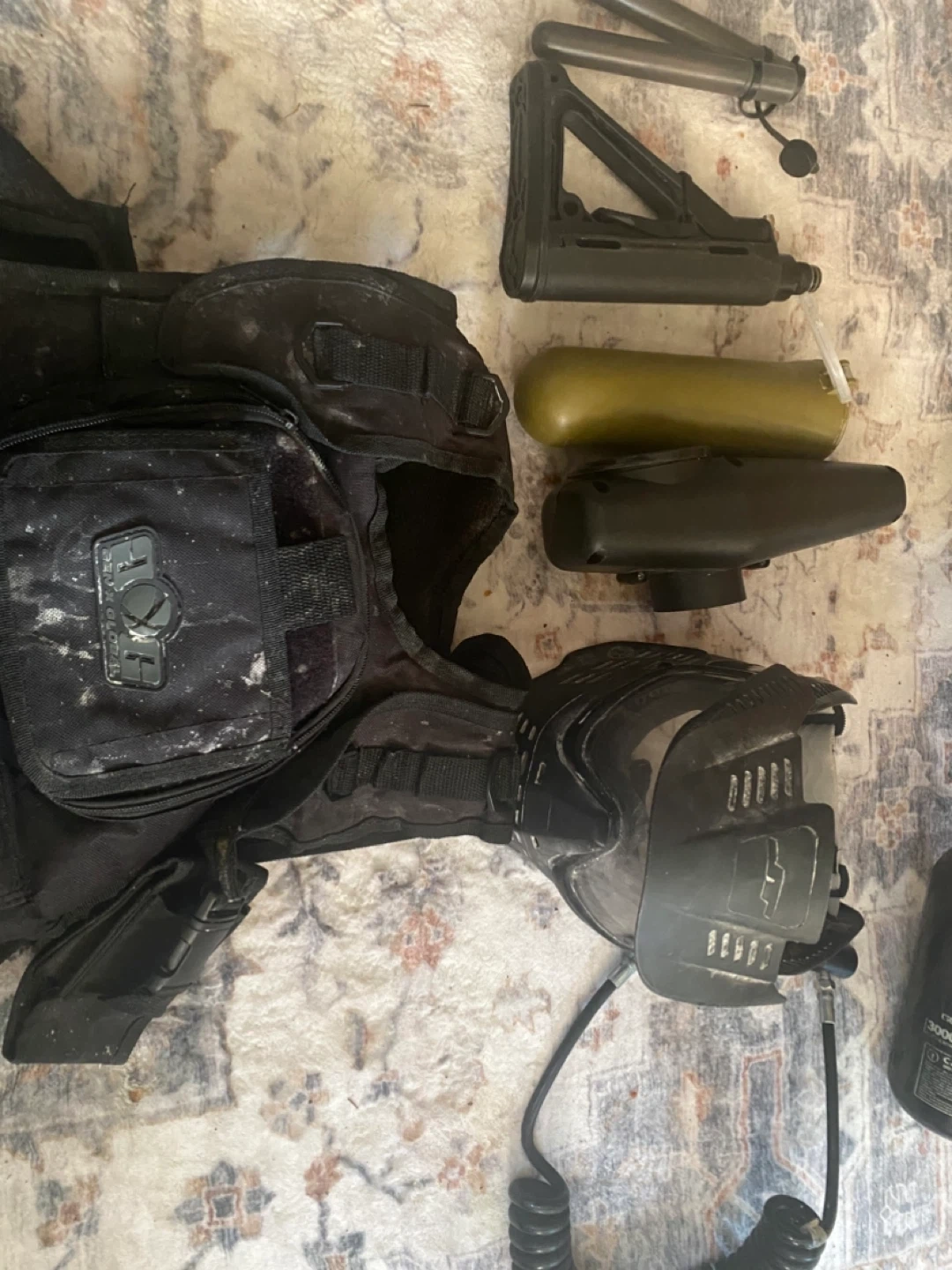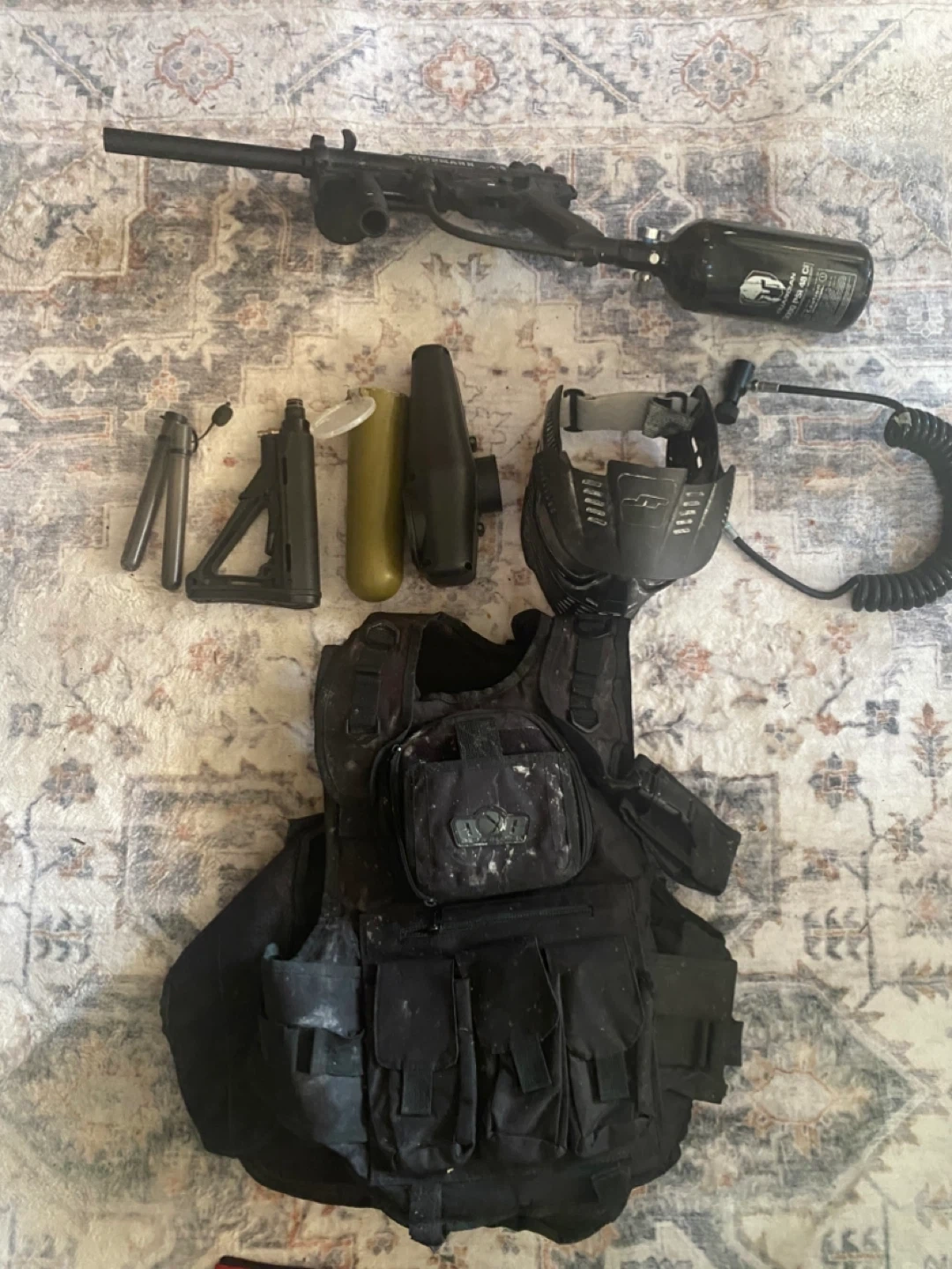 This is a Tippmann A-5 paintball marker, complete with a tactical vest and mask. It comes with an air tank and several accessories for gameplay. Ready for the next match! Full bundle .. I used probably 3 times