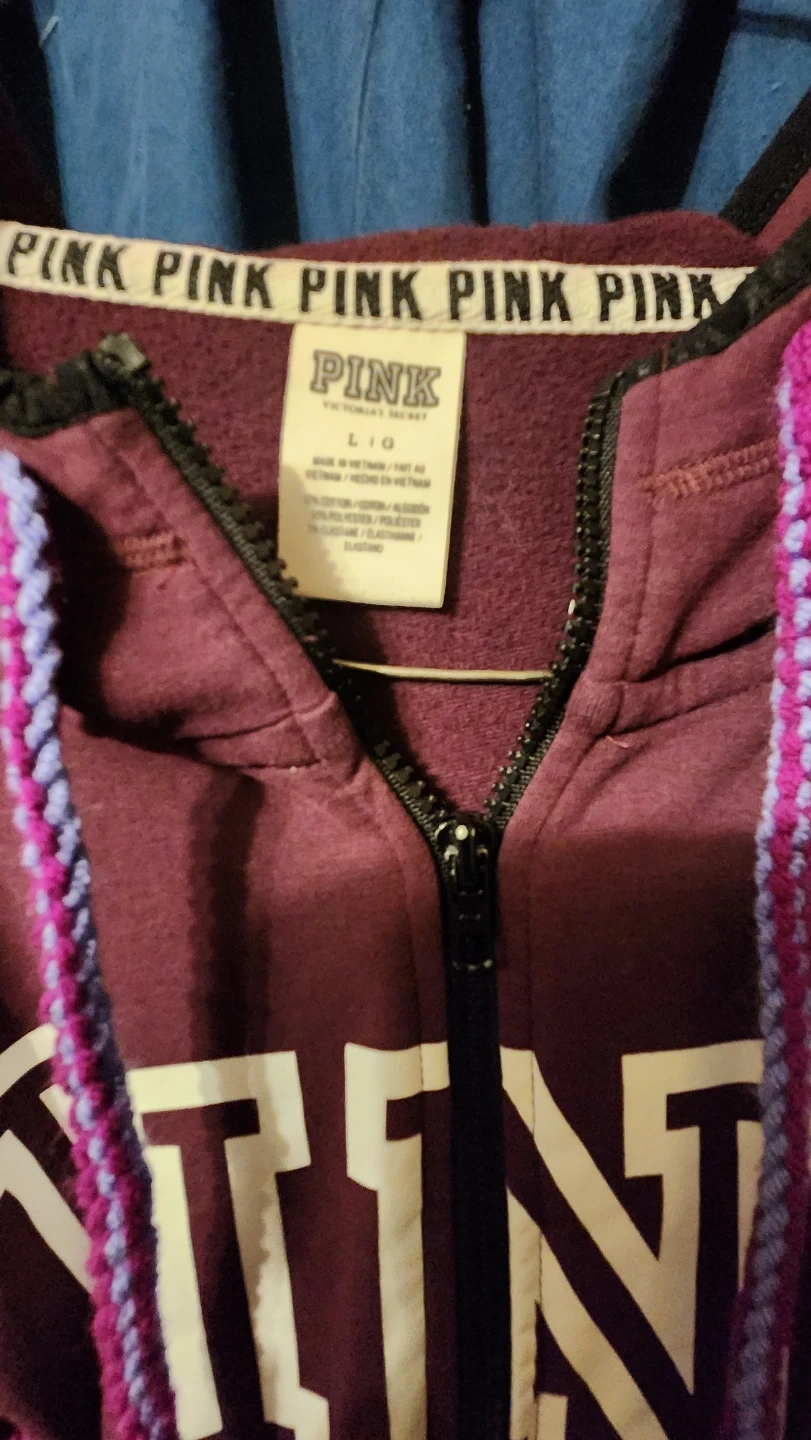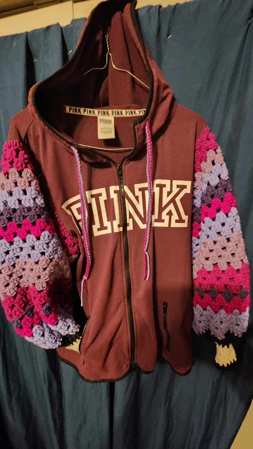 This burgundy full zip hoodie is from PINK, Victoria's Secret. It features unique crochet sleeves in shades of pink, purple, and lavender. The hoodie is size large. Great for adding a unique touch to your casual wear!