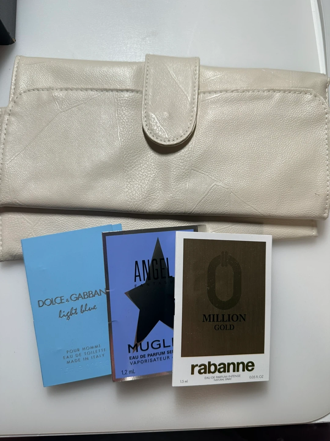 Fragrance samples: includes samples of Dolce & Gabbana Light Blue, Mugler Angel Nova, and Paco Rabanne 1 Million.