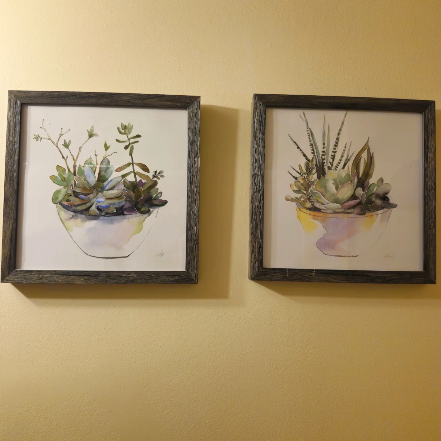 Two framed watercolour prints featuring arrangements of succulents in pots. Each print has a dark grey distressed wood-look frame. They're ready to hang and add a touch of nature to your space.