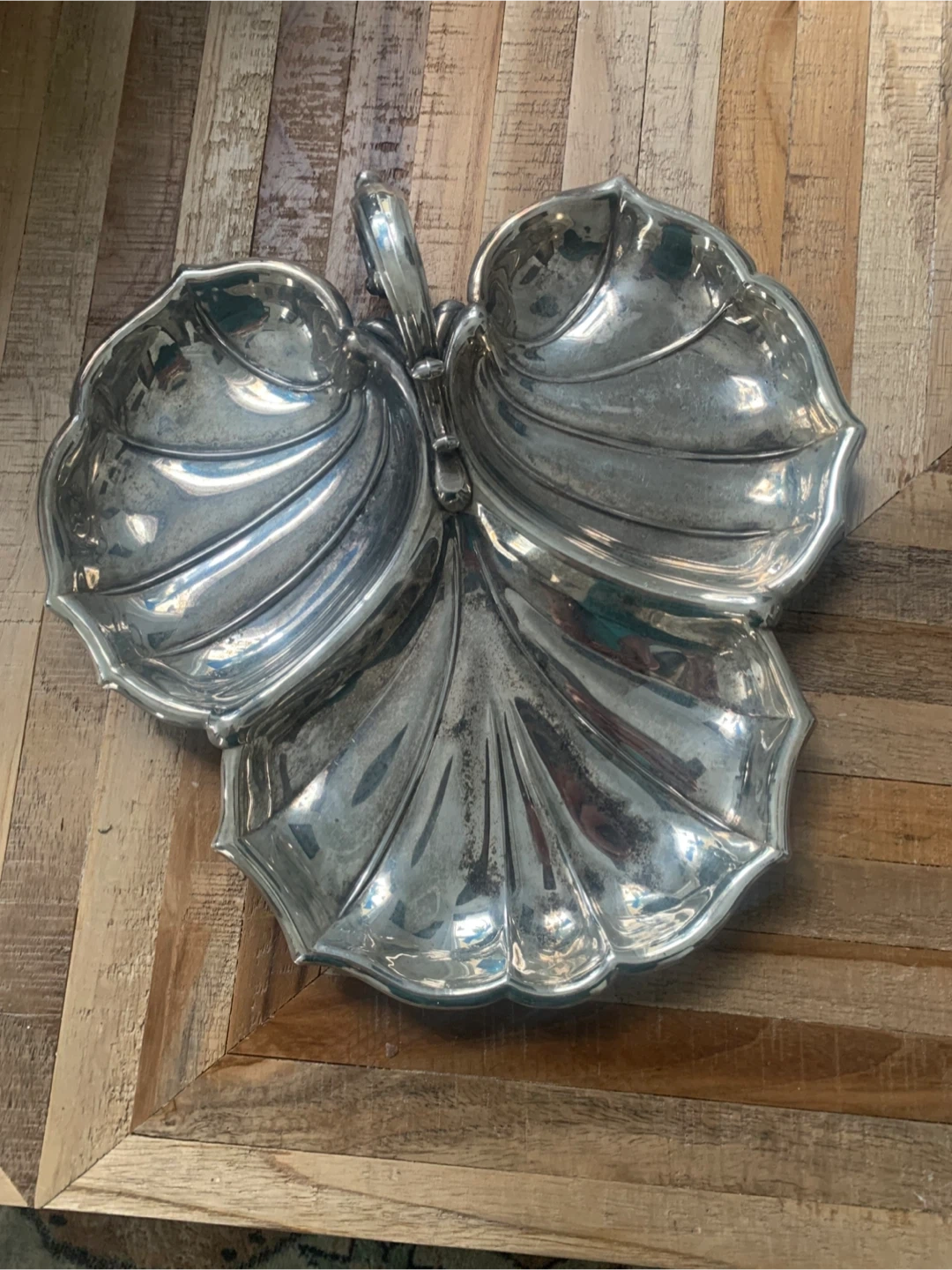 Beautiful silver-plated serving dish shaped like a leaf. It has three compartments, perfect for serving nuts, candies, or appetizers. This vintage piece adds a touch of elegance to any table setting!