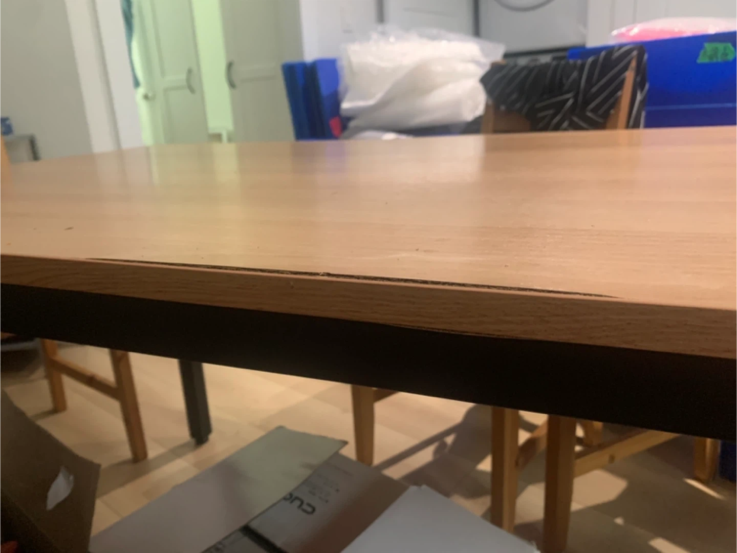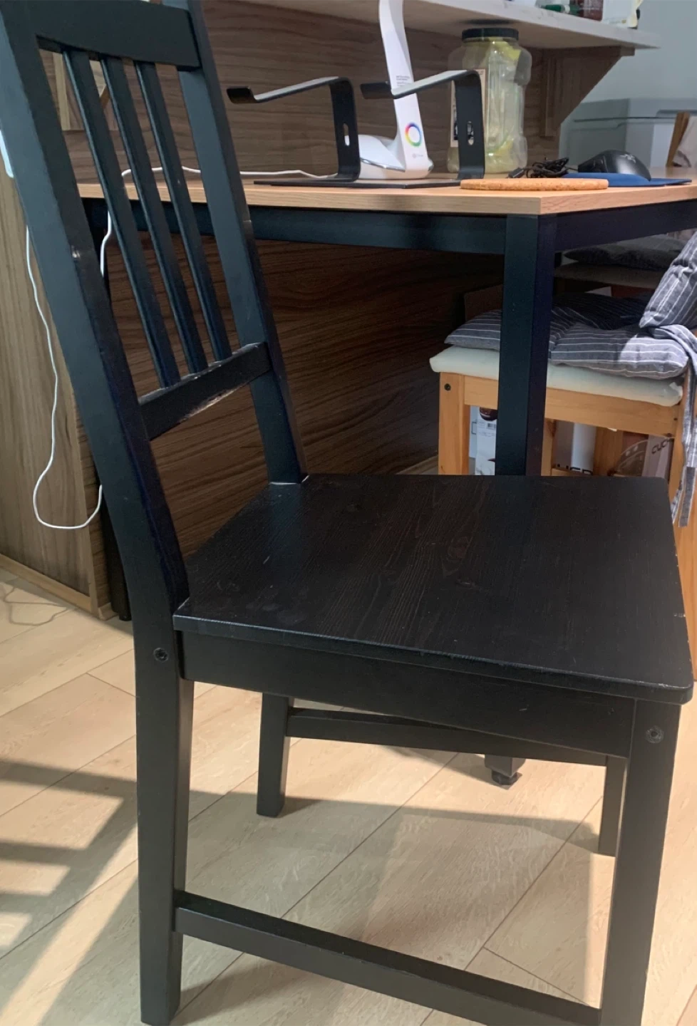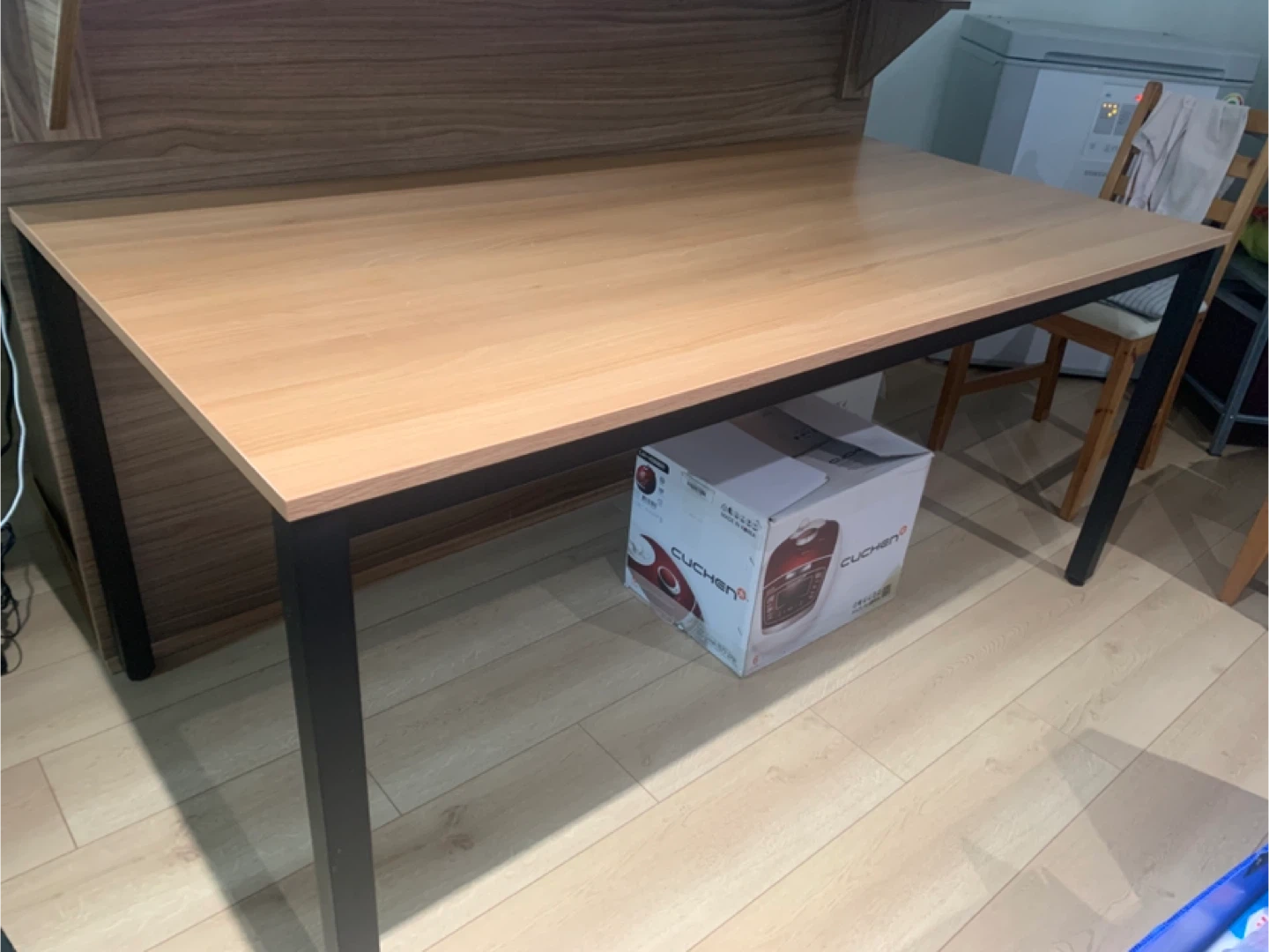 ⏰ Pickup Time: September 29(Mon), between 3-7PM Giving away a table (160 cm × 80 cm) with 4 chairs for free. Pickup only. • Table has a small water-damaged area (about 25 cm) that looks slightly lifted. It’s not noticeable from the top, only a bit visible from the side. (In the photo, it may look larger because it’s taken close up.) • Still perfectly fine to use as a dining table with a cover or as a work table. • Metal legs make it very sturdy. Please message me if you’re interested! 😊