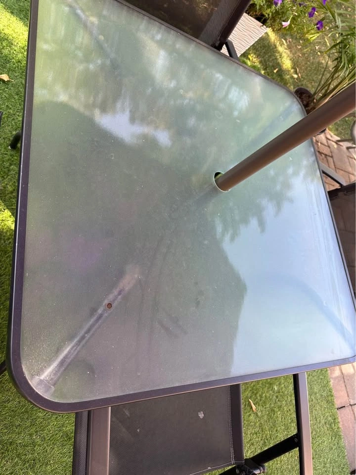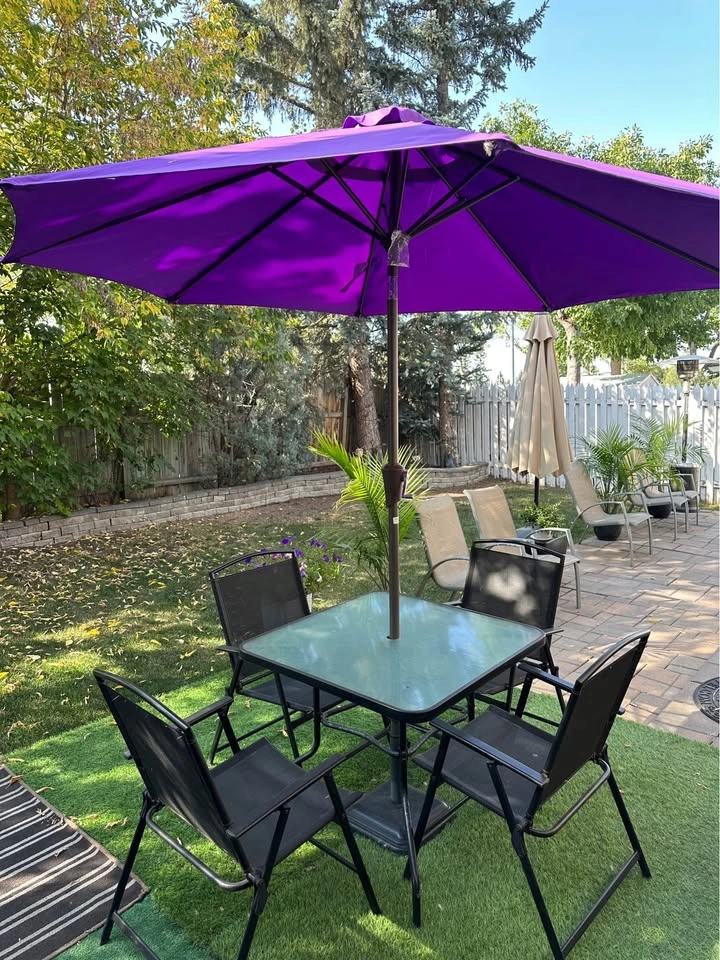 80Steel frame patio table 33” square with 4 foldable mesh/steel/plastic chairs and NEW 9’ purple easy-crank umbrella and stand.
