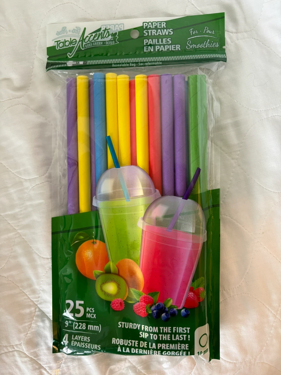 These Table Accents paper straws are perfect for smoothies and other drinks! They're sturdy from the first sip to the last. Each package contains 25 colourful straws, and the bag is resealable for your convenience