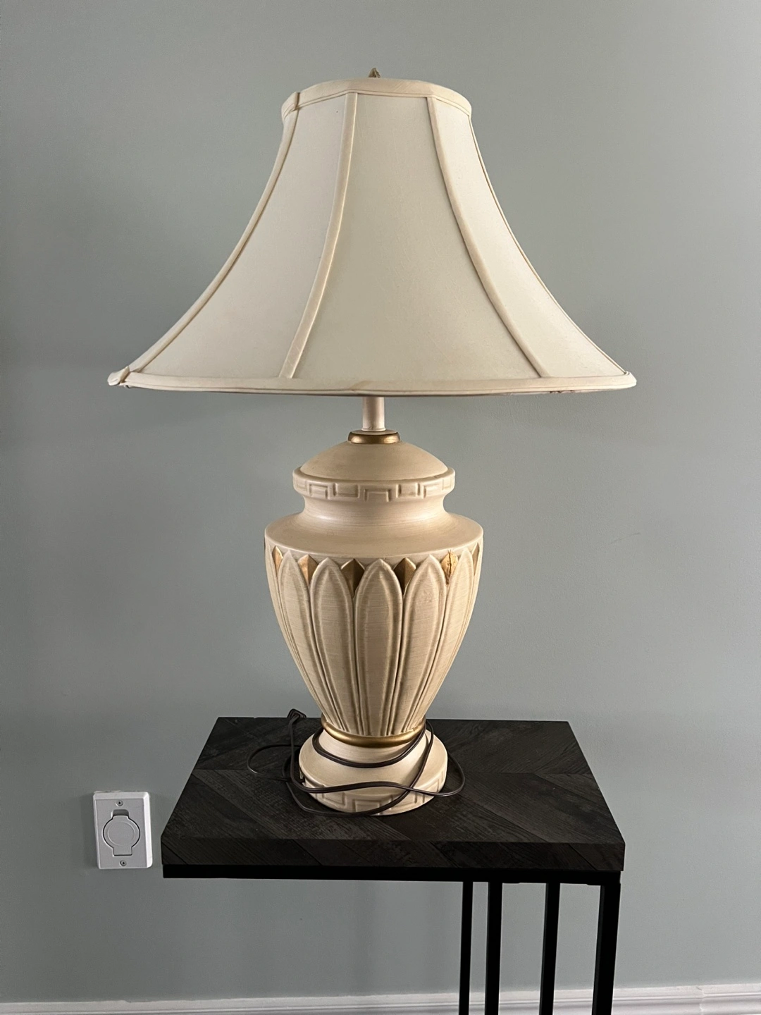 Table lamp $15 2 available. It features a creamy white colour and a classic lampshade shape. Perfect for adding a touch of elegance to any room.