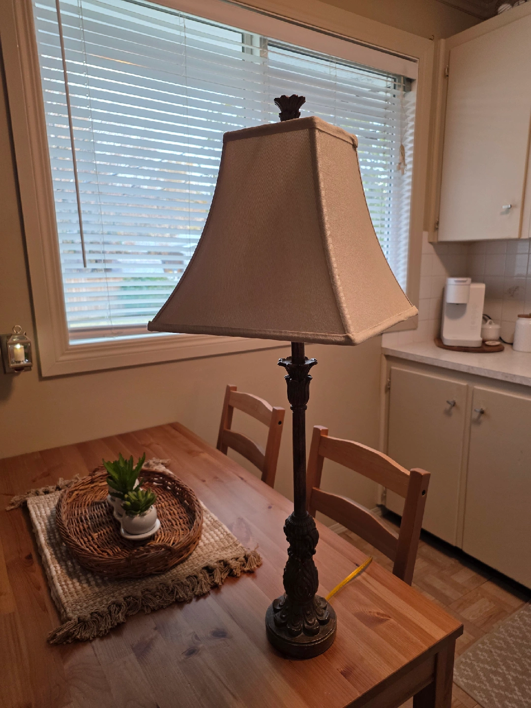10This pretty lamp is in perfect condition. Shade has no marks or discoloration. 30 inches to top of finial that holds the shade on. CASH ONLY PLEASE