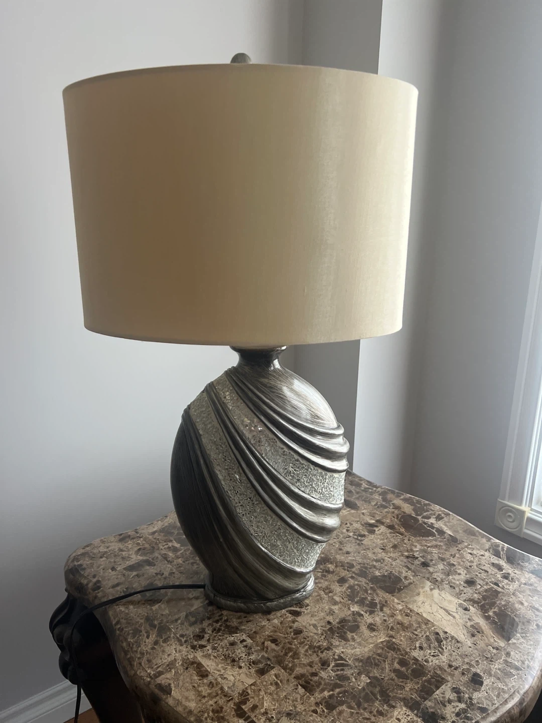 10Selling a table lamp with a neutral beige shade. It has a decorative base with a unique design. It would look great in any living room or bedroom!