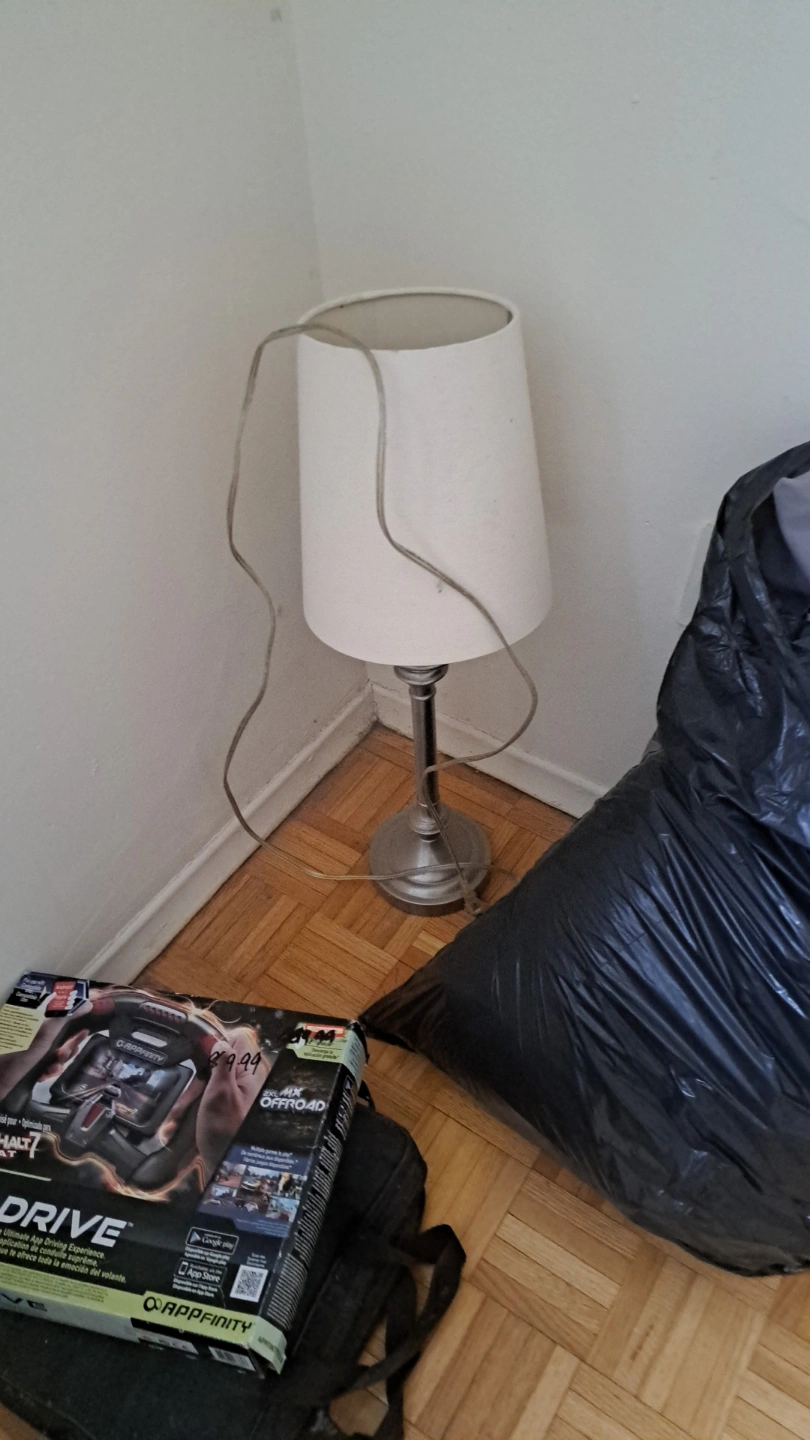 71Small table lamp, silver coloured base, off-white shade. Cord included.
