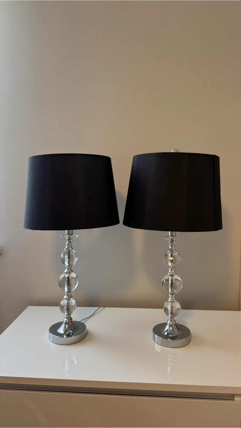15Selling a pair of table lamps with a crystal ball design and sleek black shades. These lamps would look great in a bedroom or living room. They are in excellent condition and ready to brighten up your space!