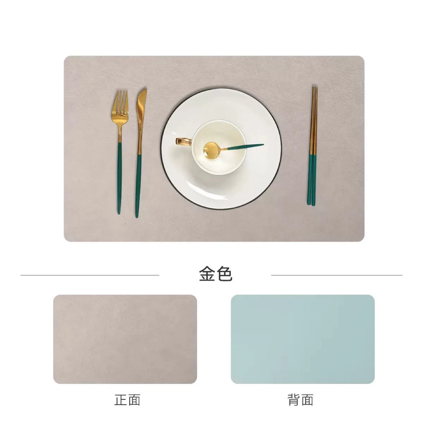 A table mat to add a touch of elegance to your dining experience! It features a modern design with gold-coloured cutlery and chopsticks on a neutral background. The reverse side has a light blue colour. Perfect for protecting your table and adding a stylish touch to your meals