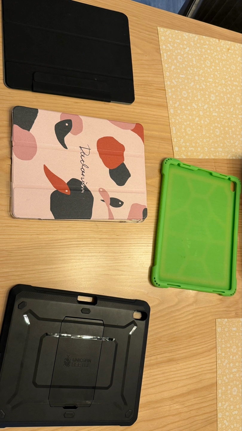 119Four tablet cases. One black, one pink with abstract design, one light green, and one black rugged case by Unicobran.