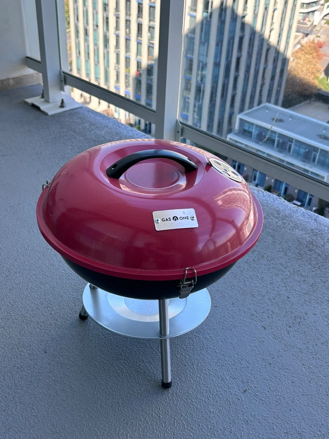 10Selling a Gas One portable tabletop grill in red. It's perfect for small spaces like balconies or patios. Easy to transport and set up for a quick BBQ. Great for camping too