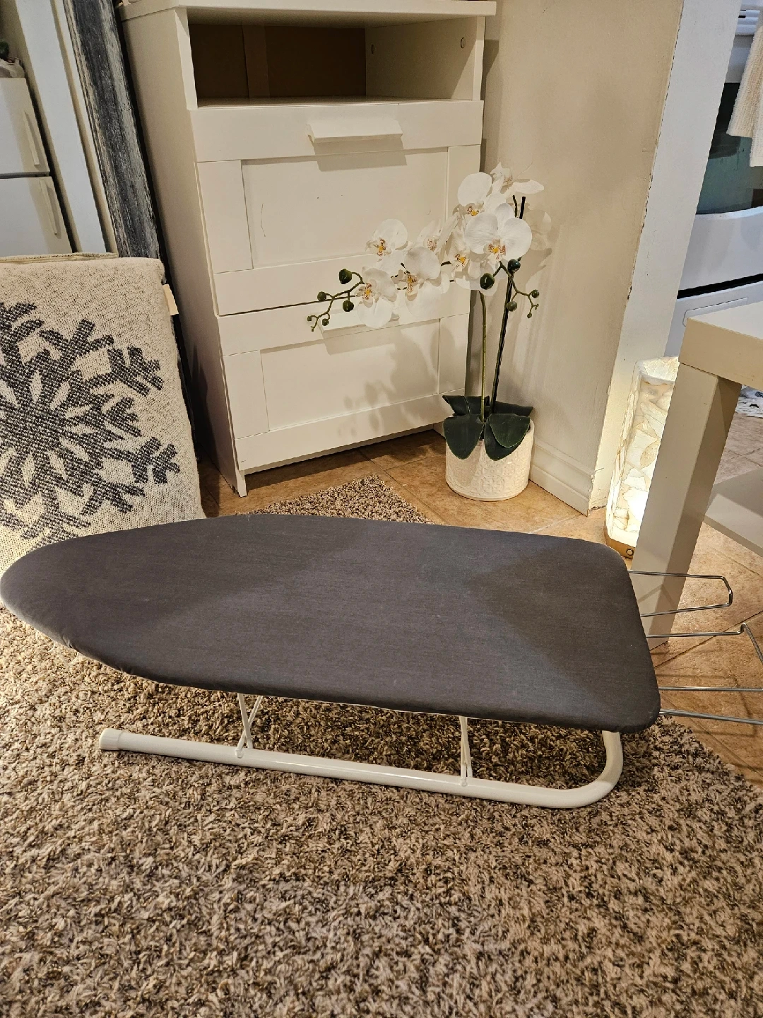 123Compact tabletop ironing board, perfect for small spaces or quick ironing jobs! It's in great shape and ready to use. The grey colour is neutral and will fit in with any decor (Rarely Used)