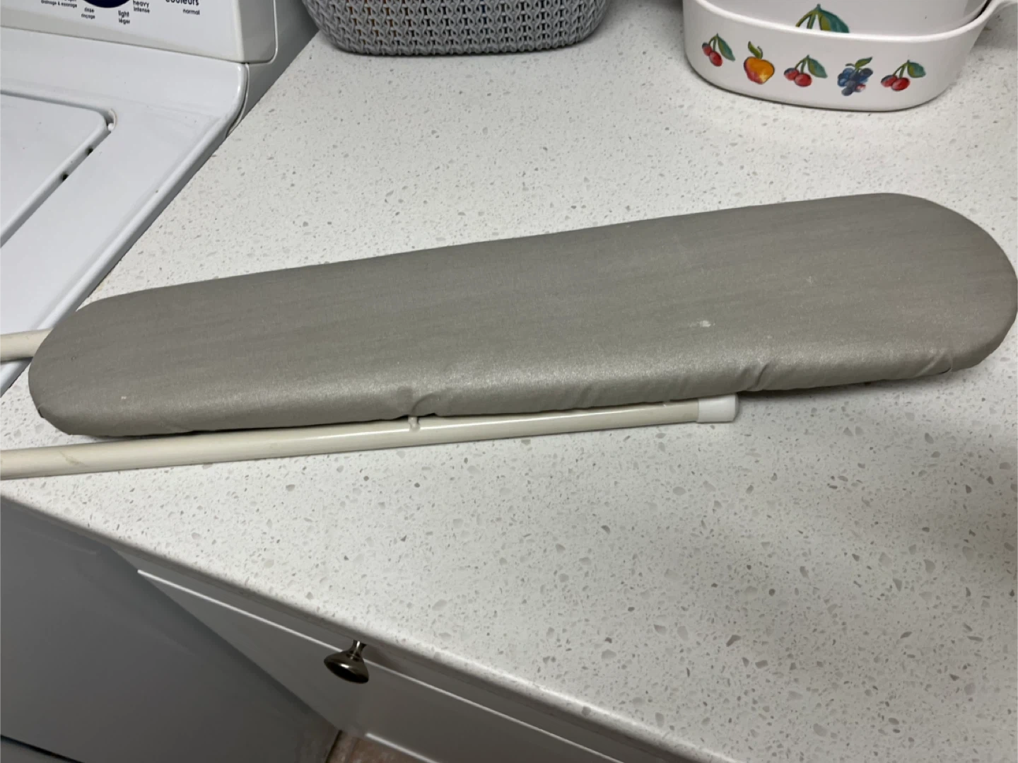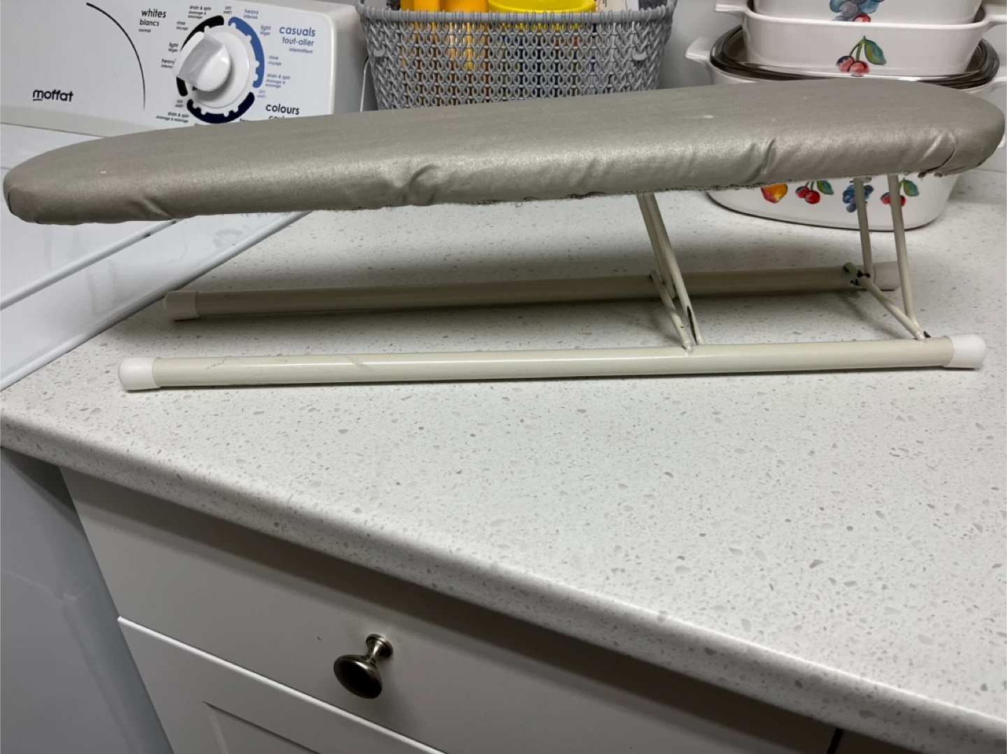 Compact size iron board, folds down has a neutral grey cover. Perfect for ironing small things and sleeves