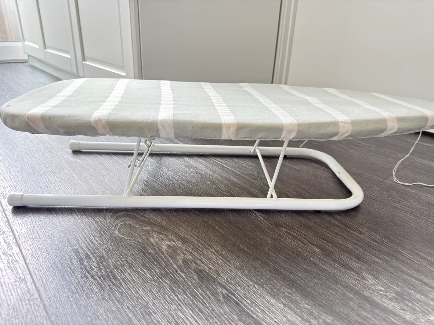 25Selling a handy tabletop ironing board! It's perfect for small spaces or quick ironing jobs. The frame is sturdy white metal, and the cover has a light green and white striped pattern. It's in great shape and ready to use!