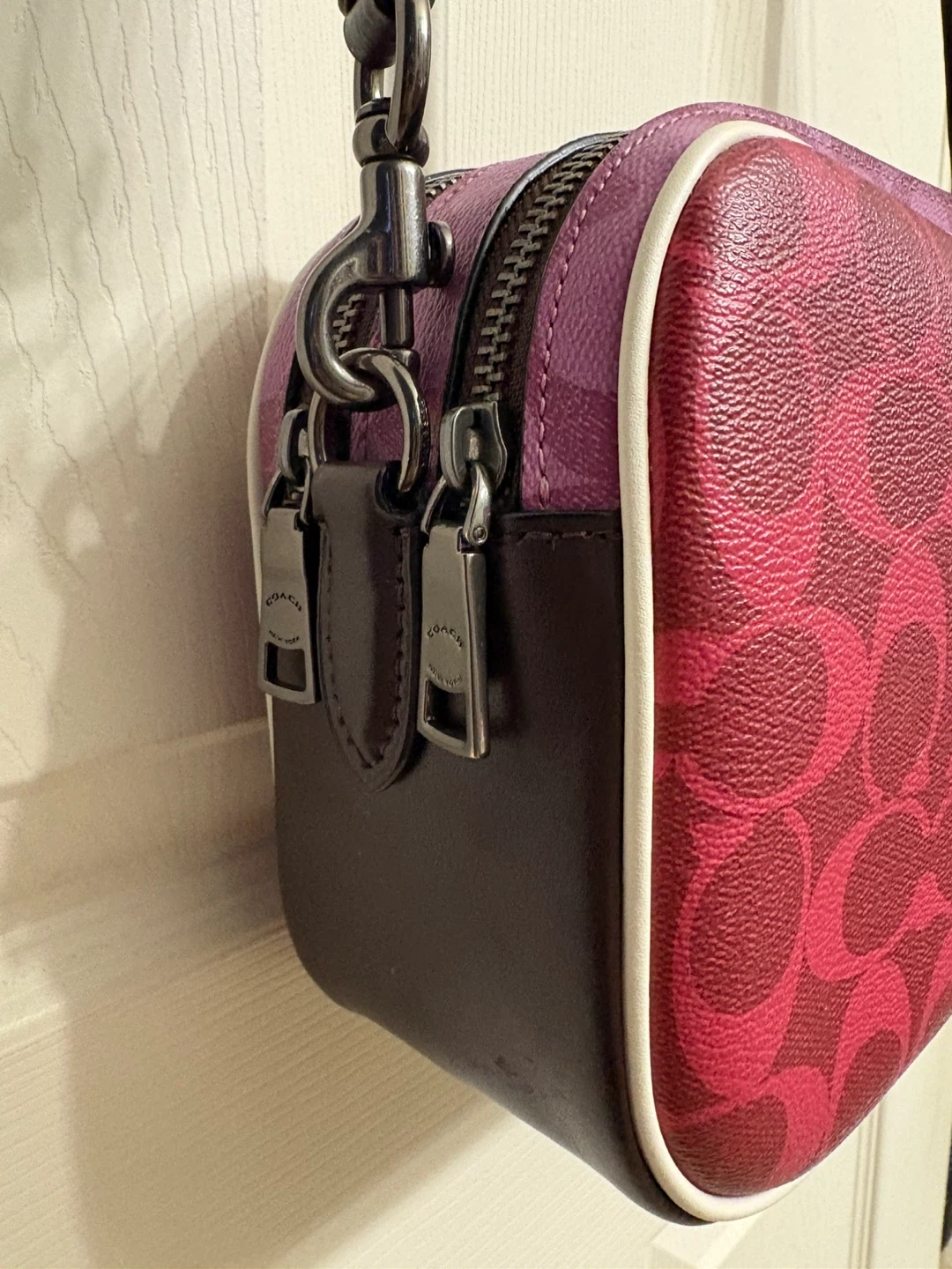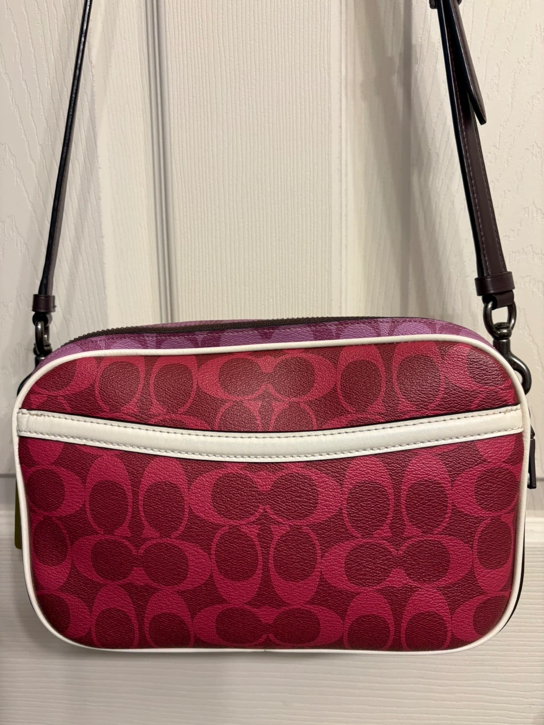 This is a Coach camera bag featuring the signature C pattern. It's a vibrant pink and burgundy colourway with a contrast white piping. The bag has a top zip closure and an adjustable shoulder strap.