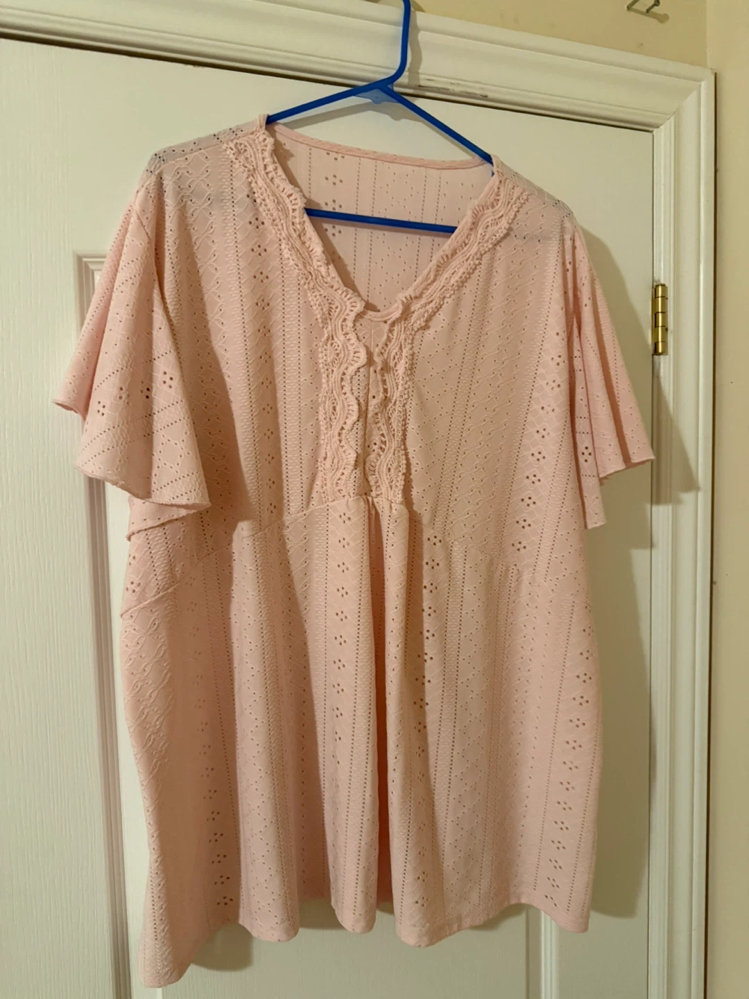 A pretty pink top with delicate eyelet detailing around the neckline and sleeves. It has short, fluttery sleeves and a flattering V-neck. Made from a lightweight, breathable fabric. 6X