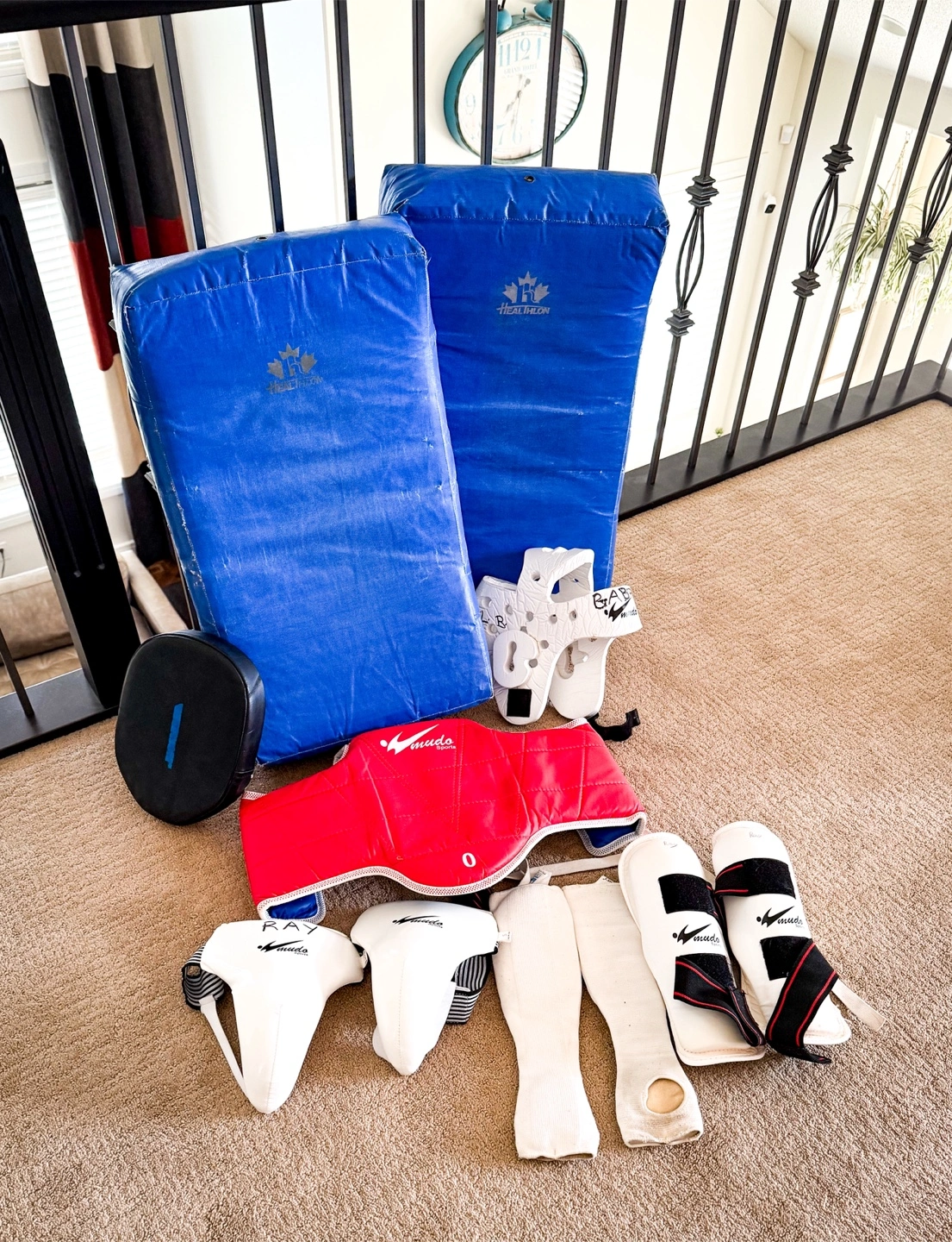 Selling a complete set of sparring gear for taekwondo or other martial arts. Includes head gear, chest protector, arm and leg guards, foot protectors, groin protector, and two kicking pads. Brands include HeaTron, Hanada, and Sportex. Great for training and sparring!