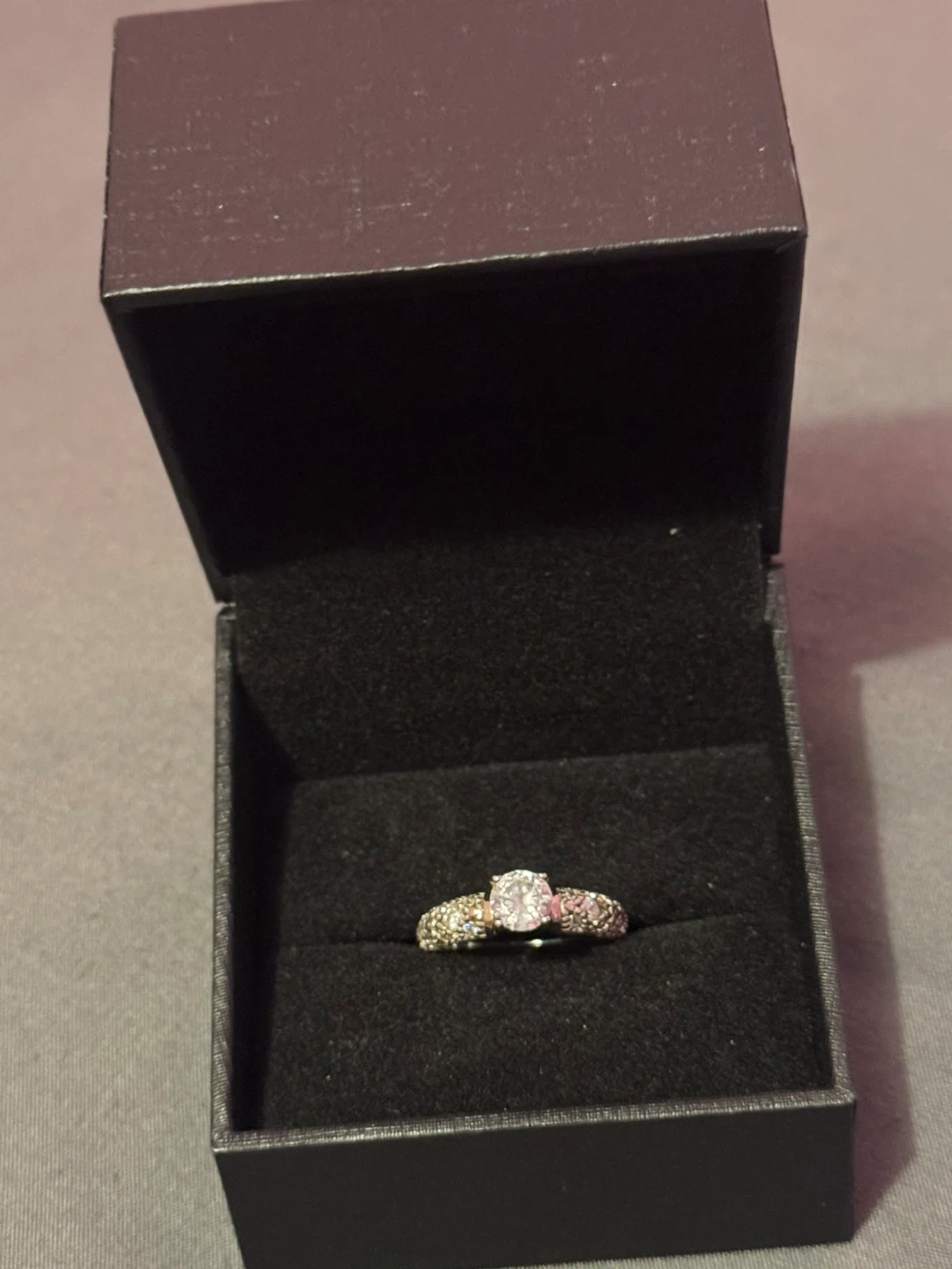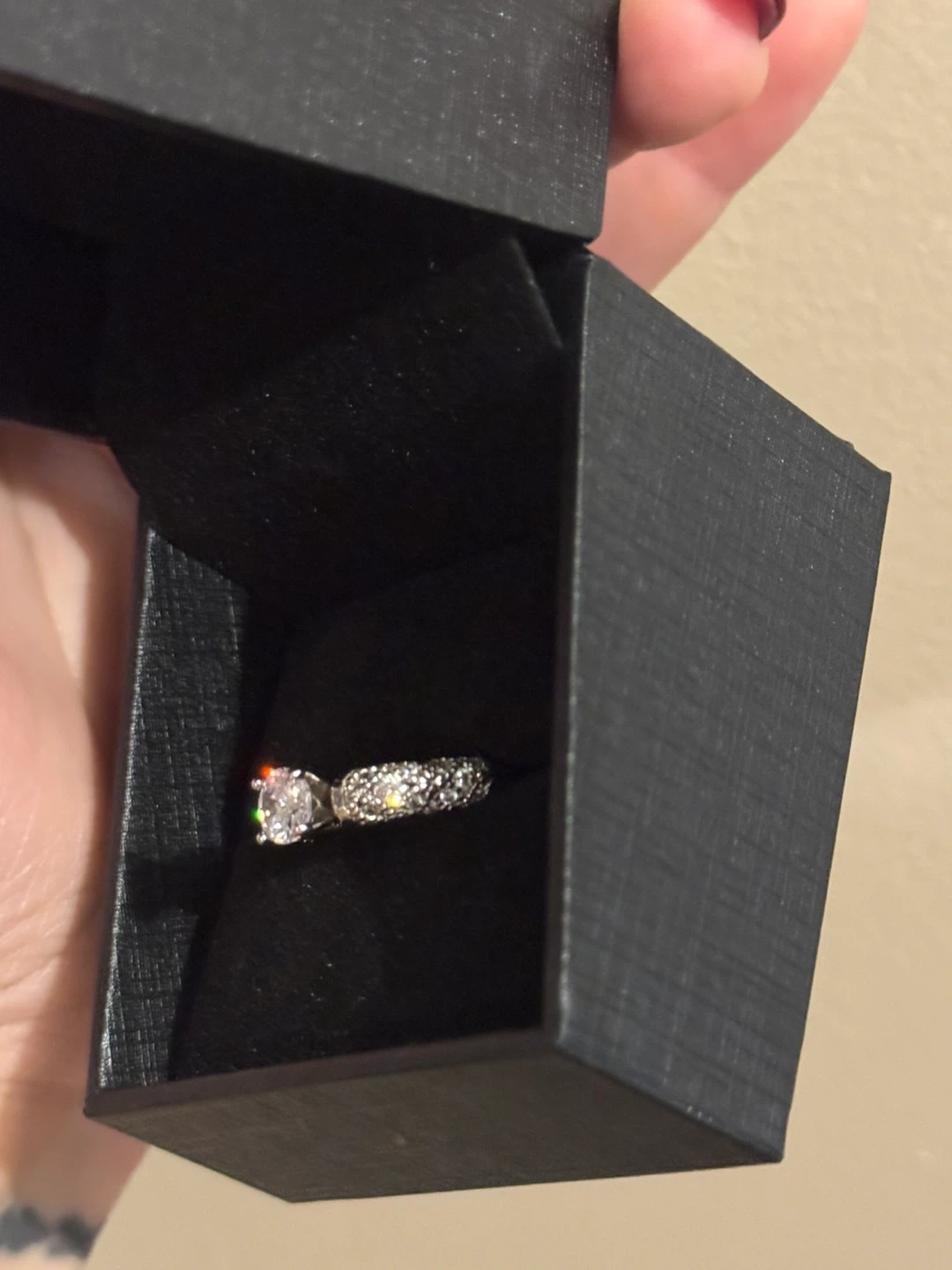 A sparkling diamond engagement ring sits in its black presentation box. The band is adorned with smaller stones, complementing the central solitaire. It's ready for a special occasion! Size 6.