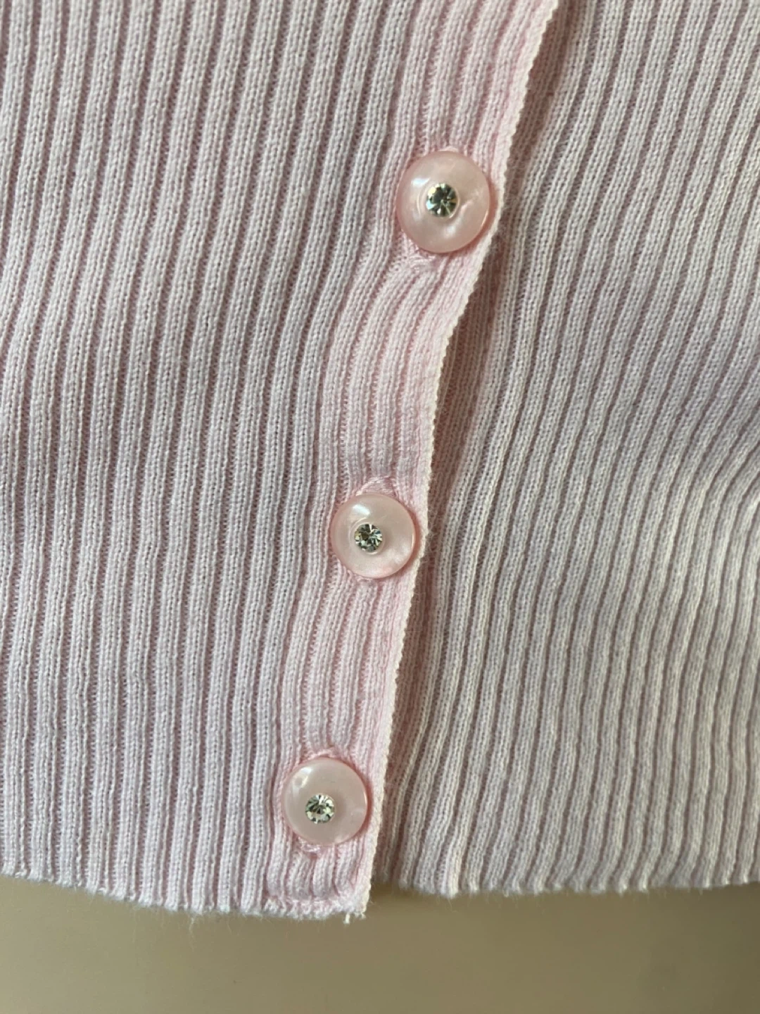 A lovely light pink cardigan with a button-up front and a cute bow detail on the neckline