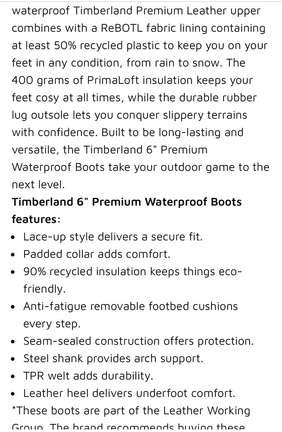 Timberland 6" Premium Waterproof Boots size 7 - Black