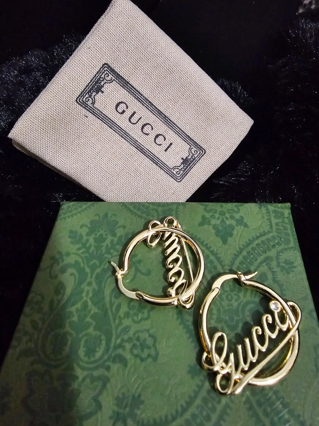 These are Gucci hoop earrings in a gold tone finish. They feature the Gucci logo script with a small crystal accent. Includes original box and dust bag.