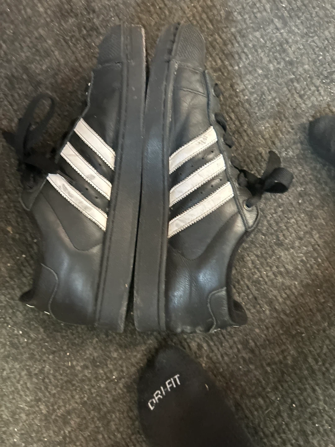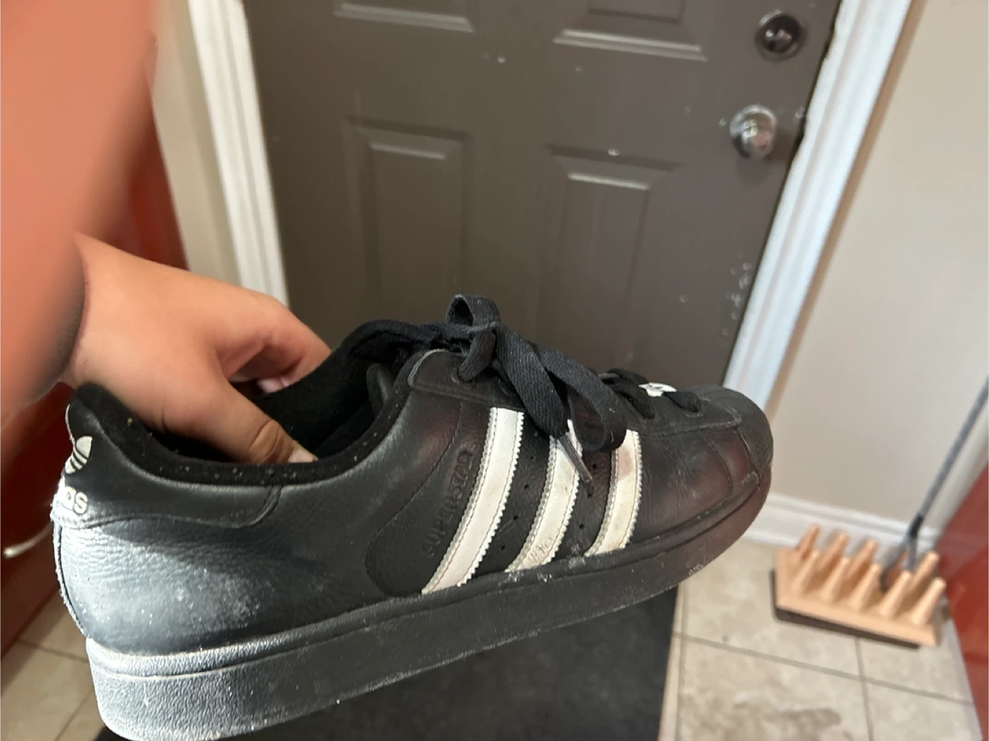 These are classic black Adidas Superstar sneakers. They feature the iconic three stripes and shell toe design. Made in Indonesia. Size 12 (US Men's).