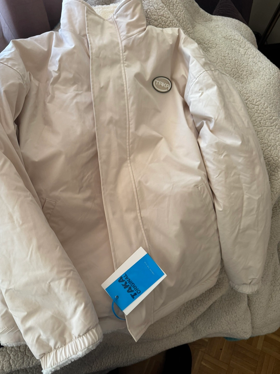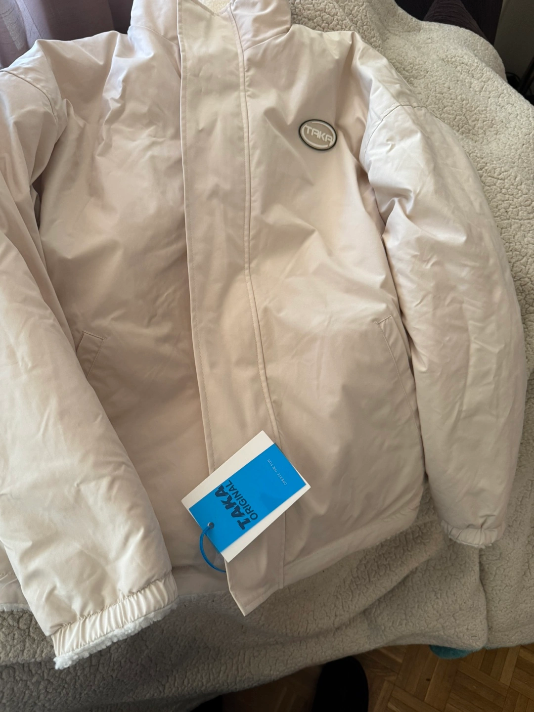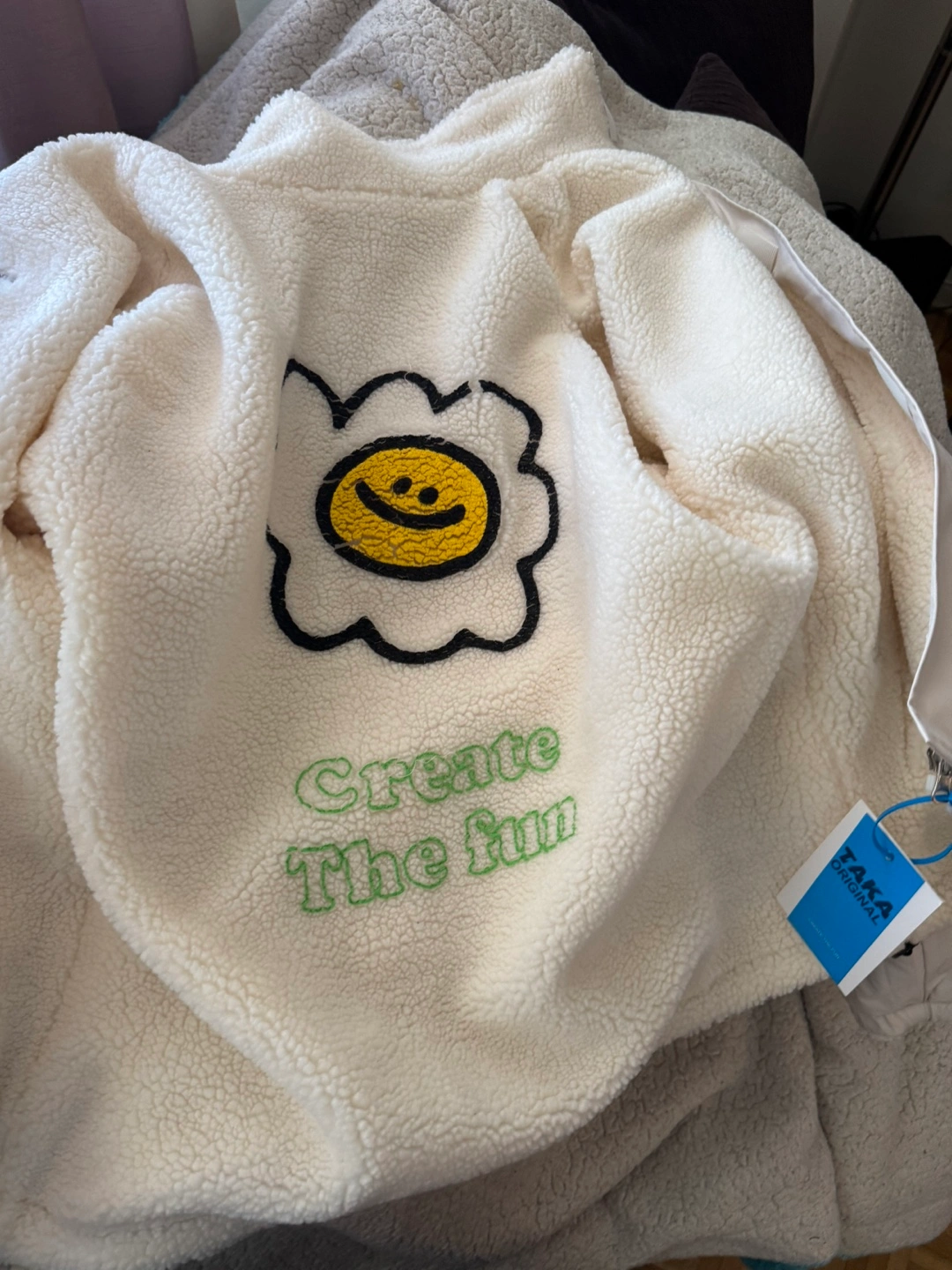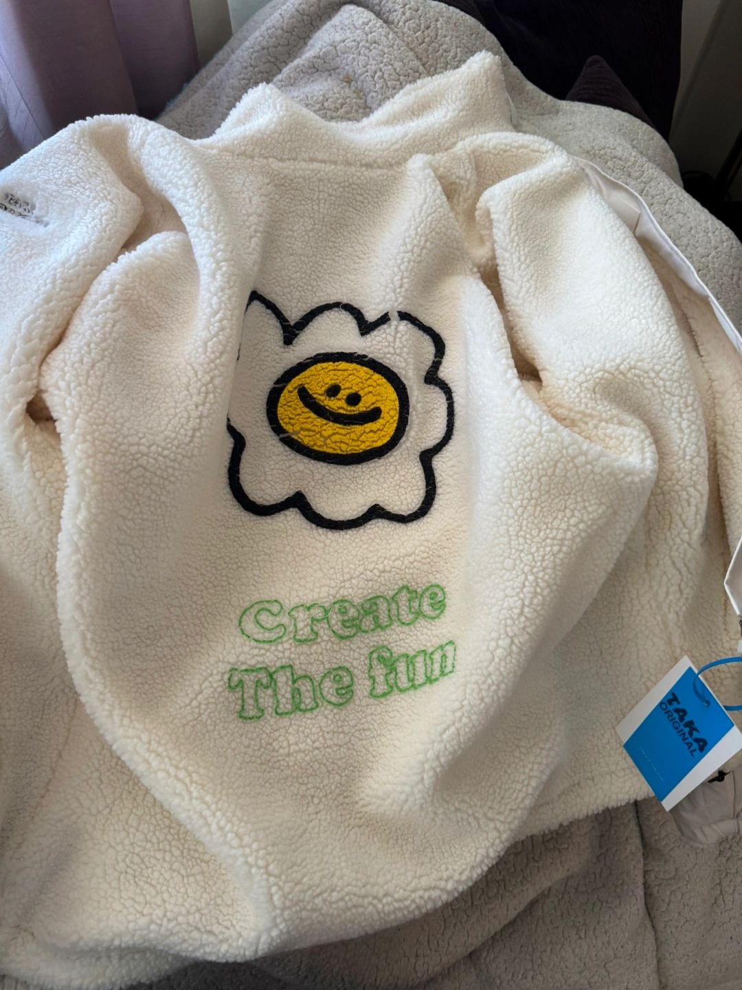 28Cream coloured sherpa jacket. Features a smiling flower and the phrase "Create The Fun" embroidered on the back. Zip up closure. Brand new with tags.